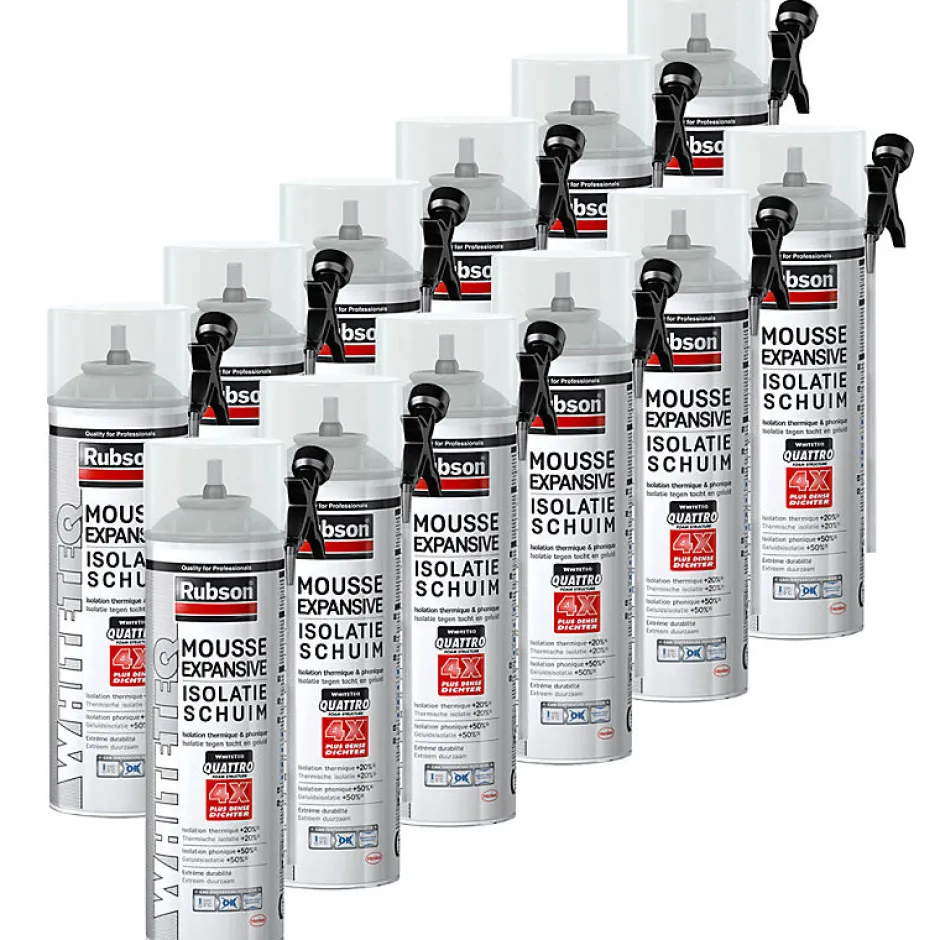 Pack de 12 mousses expansives RUBSON WhiteTeq – 500 ml Qu’est-ce que la mousse expansive RUBSON WhiteTeq ? La mousse expansive polyuréthane RUBSON WhiteTeq est un isolant thermique et phonique haute performance, conçu pour les travaux d’isolation, de calfeutrage et de remplissage de cavités. Cette nouvelle génération de mousse blanche offre une structure dense et homogène pour une isolation durable. Pourquoi choisir la technologie WhiteTeq ? Grâce à sa formulation innovante à base de polymères blancs purifiés, la mousse WhiteTeq bénéficie d’une structure Quattro exclusive avec une densité de cellules nettement supérieure, garantissant des performances accrues. • Isolation thermique améliorée (+20%)• Isolation phonique renforcée (+50%)• Structure dense avec 4 fois plus de cellules par cm³• Résistance aux UV jusqu’à 10 fois supérieure• Haute performance avec une expansion jusqu’à 33 litres Pour quels types de travaux est-elle adaptée ? La mousse expansive RUBSON WhiteTeq est idéale pour : • L’isolation de fenêtres et portes• Le calfeutrage des ouvertures et passages de câbles• L’isolation des murs, toitures et cloisons• Le remplissage de cavités et vides dans les constructions• La création d’écrans insonorisés Sur quels supports peut-elle être appliquée ? Cette mousse est compatible avec la majorité des matériaux de construction : • Bois• Béton• Plâtre• Fibre-ciment• Métal Non compatible : polyéthylène et téflon. Comment bien utiliser la mousse expansive WhiteTeq ? • Nettoyer et dépoussiérer les supports avant application• Vérifier la température de l’aérosol grâce à l’indicateur WhiteTeq•