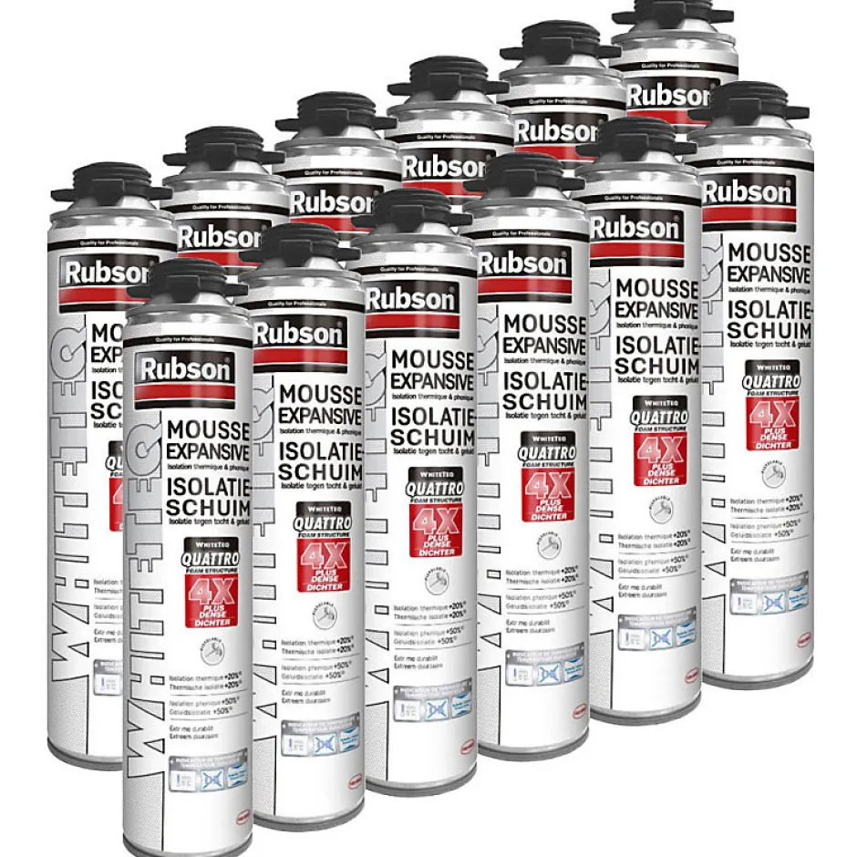 Pack de 12 mousses expansives RUBSON WhiteTeq – 750 ml Qu’est-ce que la mousse expansive RUBSON WhiteTeq ? La mousse expansive polyuréthane RUBSON WhiteTeq est un isolant thermique et phonique haute performance, conçu pour les travaux d’isolation, de calfeutrage et de remplissage de cavités. Cette nouvelle génération de mousse blanche offre une structure dense et homogène pour une isolation durable. Pourquoi choisir la technologie WhiteTeq ? Grâce à sa formulation innovante à base de polymères blancs purifiés, la mousse WhiteTeq bénéficie d’une structure Quattro exclusive avec une densité de cellules nettement supérieure, garantissant des performances accrues. • Isolation thermique améliorée (+20%)• Isolation phonique renforcée (+50%)• Structure dense avec 4 fois plus de cellules par cm³• Résistance aux UV jusqu’à 10 fois supérieure• Haute performance avec une expansion jusqu’à 33 litres Pour quels types de travaux est-elle adaptée ? La mousse expansive RUBSON WhiteTeq est idéale pour : • L’isolation de fenêtres et portes• Le calfeutrage des ouvertures et passages de câbles• L’isolation des murs, toitures et cloisons• Le remplissage de cavités et vides dans les constructions• La création d’écrans insonorisés Sur quels supports peut-elle être appliquée ? Cette mousse est compatible avec la majorité des matériaux de construction : • Bois• Béton• Plâtre• Fibre-ciment• Métal Non compatible : polyéthylène et téflon. Comment bien utiliser la mousse expansive WhiteTeq ? • Nettoyer et dépoussiérer les supports avant application• Vérifier la température de l’aérosol grâce à l’indicateur WhiteTeq• Secouer l’aérosol vigoureusement avant utilisation• Appliquer