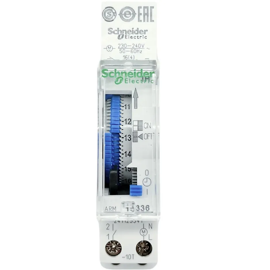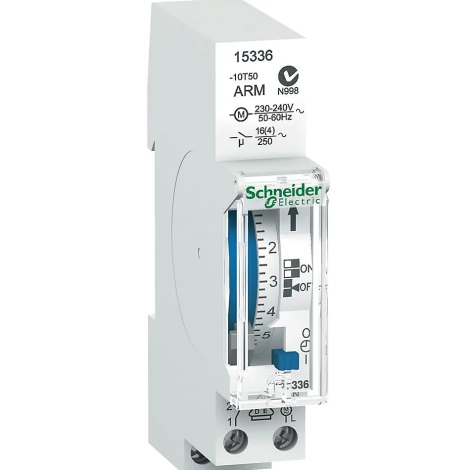 Horloge journalière avec réserve de marche – Schneider 15336Cet interrupteur horaire est fabriqué par Schneider, il est utilisé pour programmer le fonctionnement d’appareil sur une plage horaire de 24H sur 1 canal.Cet inter horaire automatique permet de commander 1 circuit distinct avec 1 programme distinct.La mise à l’heure ainsi que le changement d’heure été/hiver se font de façon manuel.L’avantage de l’interrupteur horaire analogique 15336 est sa programmation simple et rapide. Il vous suffit d’exercer une pression sur les segments de commutation (ergots bleus) aux horaires ou vous souhaitez activer le programme. Le disque de réglage central indique la période de commutation. La précision de la programmation est de l’ordre de +/- 1s par jour.L’horloge programmable 15336 doit être installée sur un circuit de tension 230Vca et d’intensité 16A. Bien que le constructeur préconise l’installation de l’interrupteur programmable pour une commutation jusque 16A, nous vous conseillons de le relayer par un contacteur modulaire pour augmenter la durée de vie des contacts.Les avantages de l’interrupteur programmable Schneider 15336 :96 commutationsActive et désactive automatiquement les charges selon le programmeIntervalle minimum de 15 minutesMise à l’heure et passage à l’heure d’été/hiver manuelRéserve de marche de 100h en cas de coupure