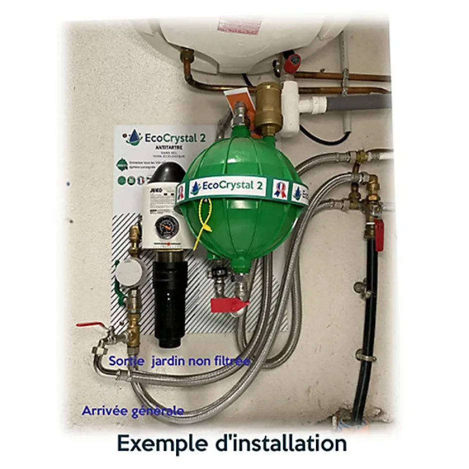 L’adoucisseur d’eau EcoCrystal 2 filtre et dynamise l’eau de votre habitation. Il se compose de deux produits complémentaires: EcoCrystal et Dynam’Eco, qui protègent votre habitation du tartre et vous procurent une eau agréable à boire. 1- EcoCrystal, à l’arrivée généraleCe système de filtration unique remplace avantageusement les adoucisseurs à sel.EcoCrystal transforme le tartre en aragonite grâce au frottement de l’eau sur une roche volcanique venue de la Chaîne des Puys d’Auvergne. L’eau passe ensuite sur du charbon actif, produit à partir de hêtres du Vercors, qui absorbe une partie du chlore et des produits chimiques. En sortant de la sphère, l’eau est dynamisée par un puissant vortex. Elle est agréable à boire et conserve toute sa minéralité (calcium, magnésium). Elle est également moins agressive sur la peau. Le tartre ne se dépose plus dans vos installations (chauffe-eau, lave linge…) et vos tuyaux sont nettoyés sans corrosion. Très facile à installer, le support de l’EcoCrystal se fixe au mur à l’arrivée générale. Aucune consommation électrique, pas de rejet de saumure, pas d’ajout de sodium dans l’eau.La sphère doit être changée tous les 100m³ d’eau ou tous les 2 ans. Un compteur est fourni avec l’EcoCrystal afin de suivre votre consommation.Chaque sphère est consignée. Vous bénéficiez d’un avoir immédiat de 40€ à chaque retour de sphère.2- Dynam’Eco, le purificateur d’eau sous-évier en inoxGrâce à la cartouche associant charbon et KDF, l’eau de votre cuisine est filtrée une seconde fois pour retirer les impuretés chimiques: chlore, mauvais goûts, résidus de médicaments, de pesticides et métaux lourds. Elle est ensuite dynamisée par un vortex et conserve tous ses sels minéraux. Discret, le filtre se place à l’arrivée d’eau froide sous l’évier de la cuisine au fond du placard.