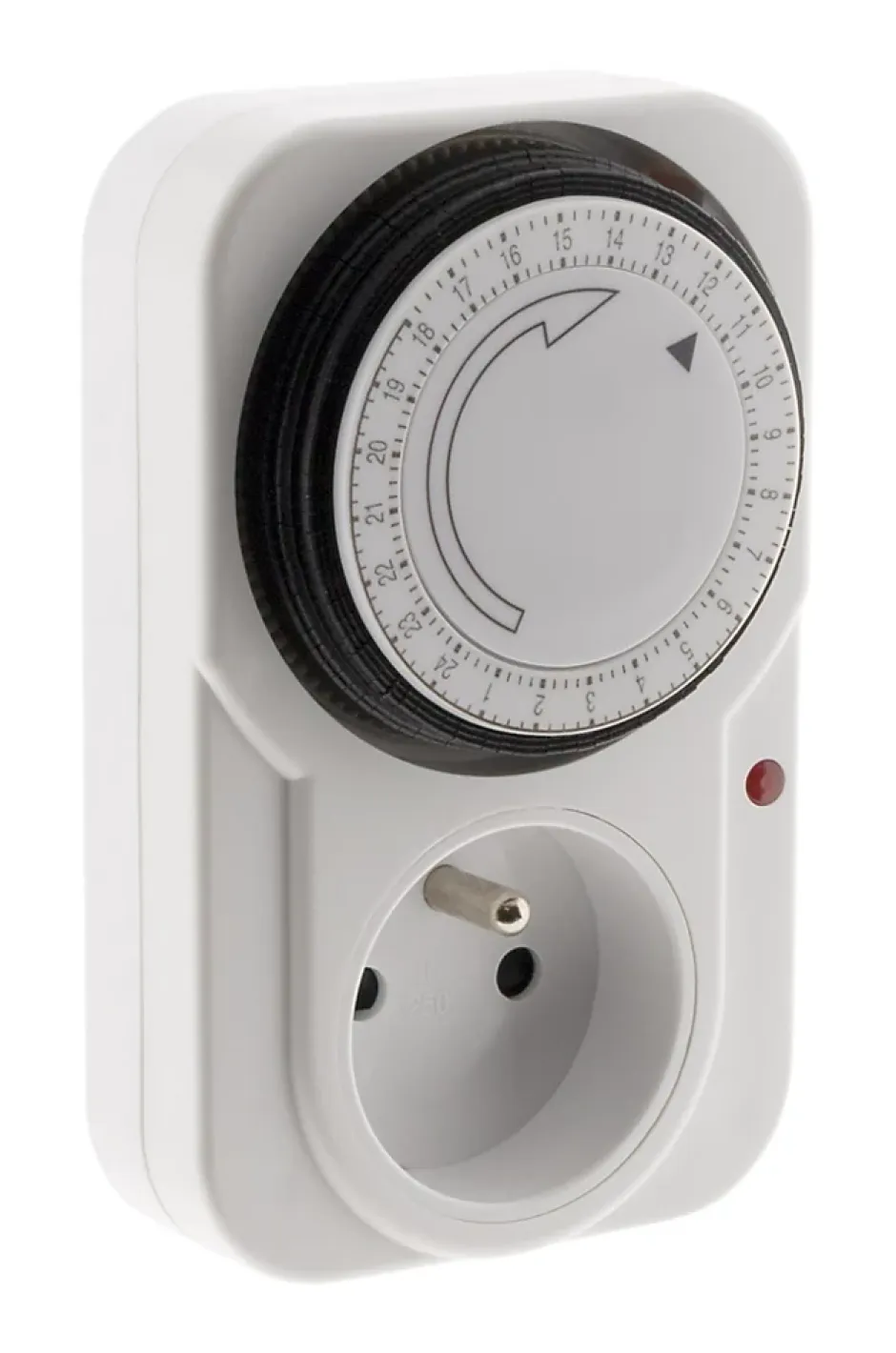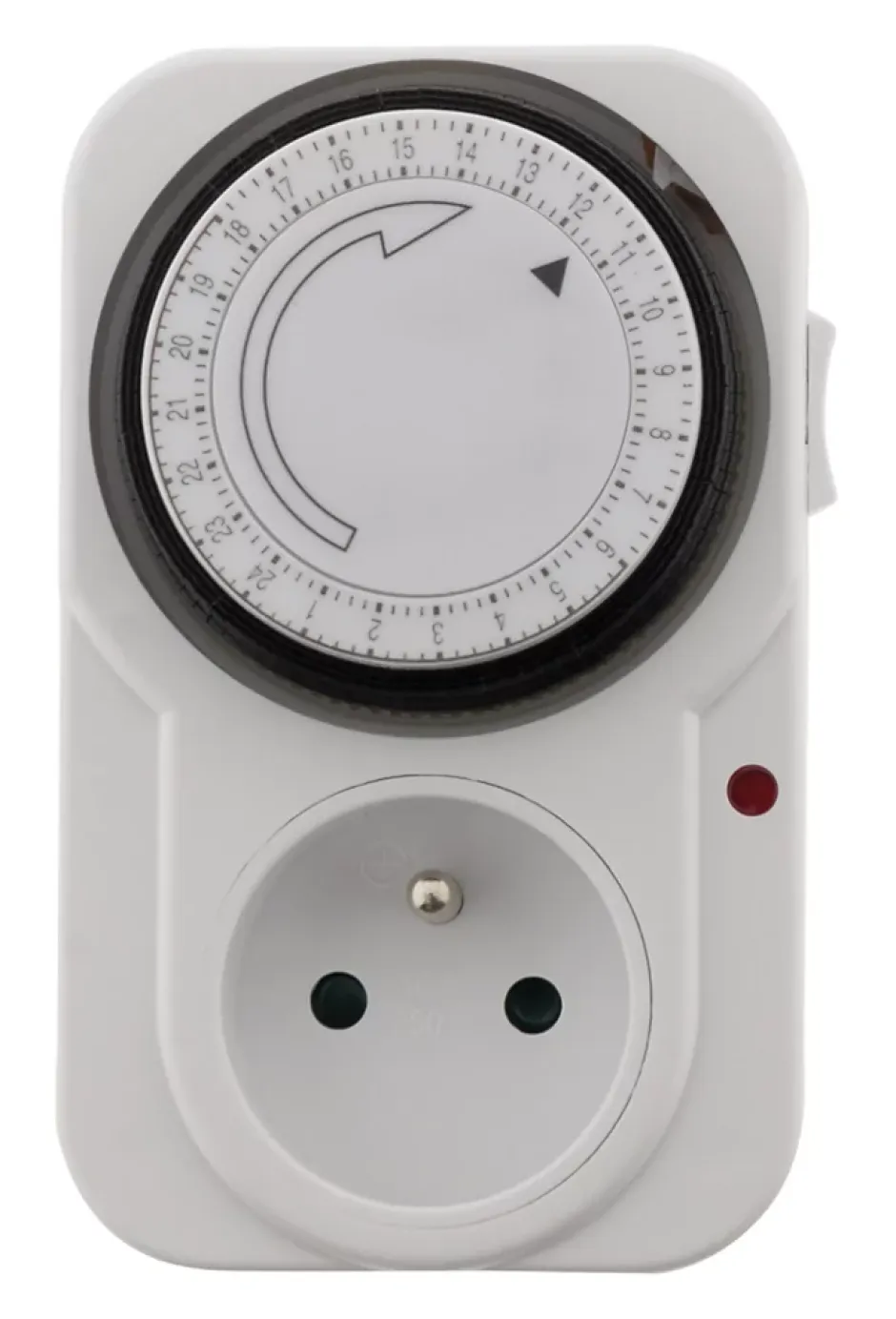 Programmateur journalier mécanique. Puissance maximale : 3500W. Intervalle de programmation : par tranches de 15 minutes. Indicateur lumineux : voyant de fonctionnement. Interrupteur intégré pour basculer entre mode automatique et manuel. Utilisation intérieure