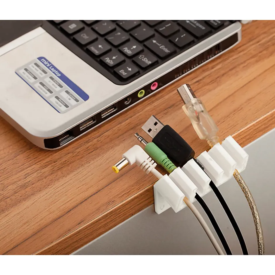 Lot de 2 range câble. Adhésifs pour fixation sur table, étagères, ou toute autre surface lisse. 2 éléments adhésifs pour fixer tous vos câbles où vous le souhaitez. 5 fixations pour une installation flexible et sécurisée. Norme(s) : CE
