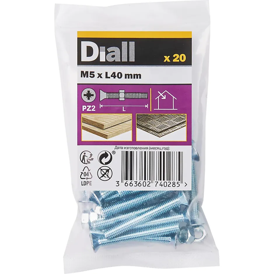 Les 20 boulons et écrous fraisés zingués de ce pack sont fabriqués à partir d’acier au carbone. Ils mesurent 40 mm de long et ont un diamètre M5. Ils sont idéaux pour tout un éventail de projets de bricolage.