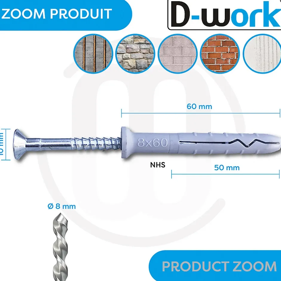 Améliorez l’efficacité de vos travaux de fixation avec le lot de 200 Chevilles à Frapper NHS D. 8 x Lt. 60 mm avec Vis Tête Fraisée de la marque D-Work. Conçues pour une utilisation polyvalente dans une multitude de projets de construction et de bricolage, ces chevilles à frapper offrent une fixation solide et fiable dans une variété de matériaux. Caractéristiques Techniques : : Dimensions Précises span> : Les chevilles ont un diamètre de 8 mm et une longueur de 60 mm, offrant ainsi une adhérence optimale dans divers matériaux de construction. Vis Tête Fraisée span> : Chaque cheville est livrée avec une vis à tête fraisée assortie, garantissant une fixation solide et esthétique pour une variété d’applications. E.L.S : De 10 à 45 daN. Longueur totale : 60 mm Diam. de perçage : 8 mm Épaisseur pièce à fixer : 10 mm Longueur expansion : 50 mm Diamètre tête de vis fraisée : 10 mm Applications : : Fixation de Rails pour Plaquiste span> : Ces chevilles sont idéales pour sécuriser les rails utilisés par les plaquistes lors de la construction ou de la rénovation de cloisons. Fixation de Tasseaux pour Menuisiers span> : Elles sont parfaites pour fixer solidement les tasseaux utilisés par les menuisiers pour la construction de meubles ou de structures en bois. Fixation d’Appareillage pour Électriciens span> : Ces chevilles assurent une fixation fiable de l’appareillage électrique sur divers supports, garantissant ainsi la sécurité des installations électriques. Avantages Exceptionnels : : Polyvalence d’Utilisation span> : Adaptées à une variété de matériaux de construction, ces chevilles conviennent à une large gamme d’applications, du travail du bois à la maçonnerie. Facilité d’Installation span> : Grâce à leur conception simple, elles s’installent rapidement et f