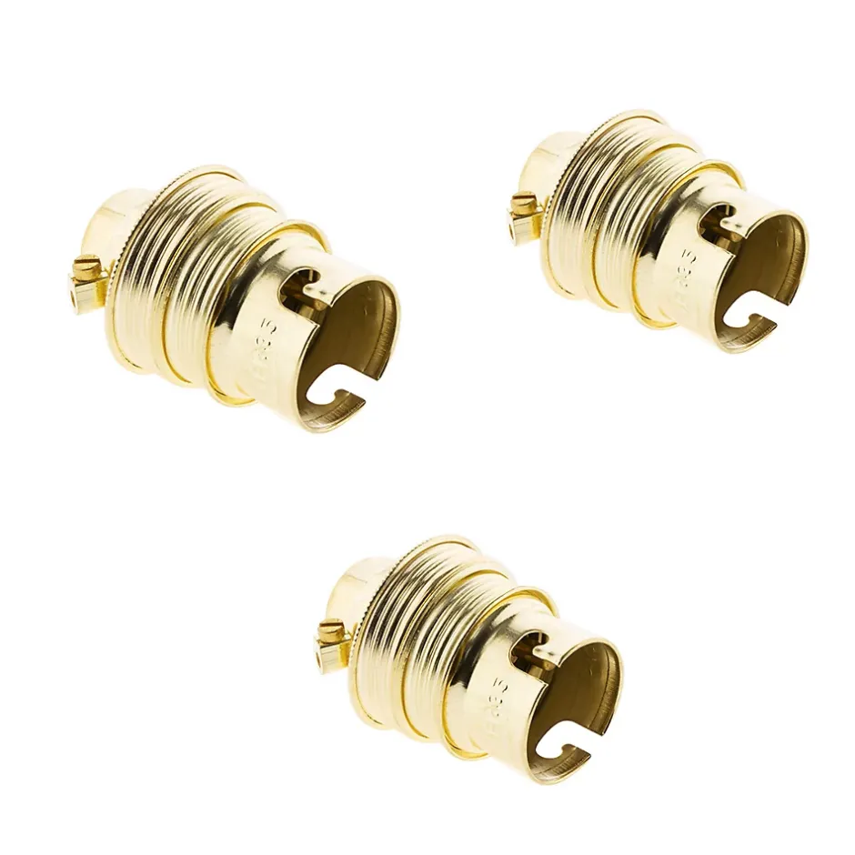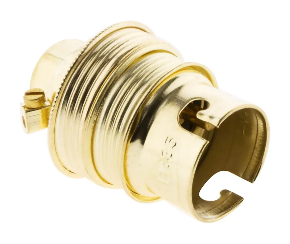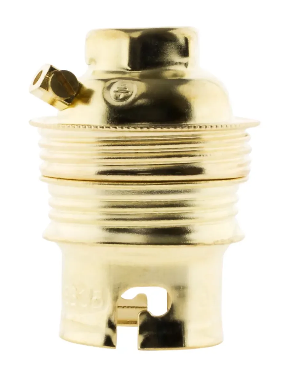 Douille B22. Matériau : acier laitonné résistant. Double bague. Borne de terre intégrée pour sécurité renforcée. Tension / Intensité : 250V – 2A. Idéale pour luminaires décoratifs ou installations électriques sûres. Facile à intégrer dans divers supports