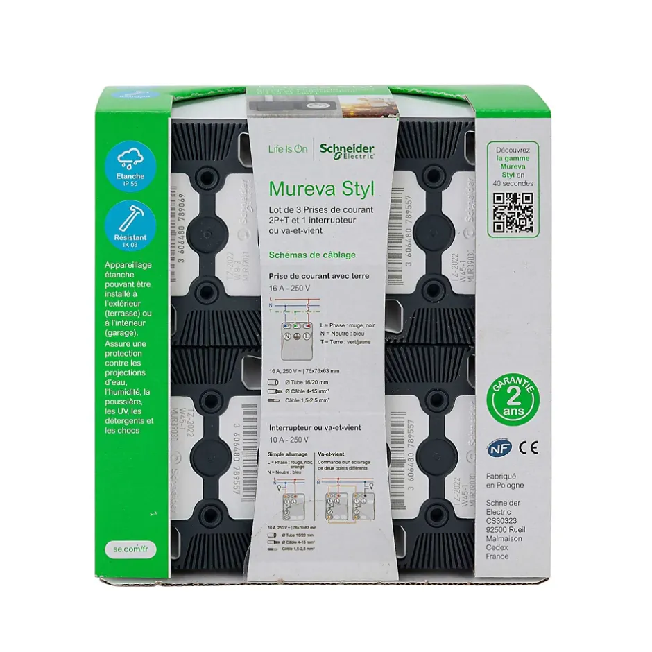 Lot 3 prises de courant 2P+T et 1 interrupteur/va et vient – Mureva Styl – blanc. Mureva Styl est une gamme d’appareillage robuste et résistante à l’eau, conçue pour les environnements extérieurs. Les produits couvrent l’ensemble des besoins. L’installation est simple et rapide. Son design intuitif et innovant se fonde sur une ergonomie avancée, un minimum de pièces – qui s’assemblent simplement, et un important espacede câblage. Cette gamme d’appareillage est idéale pour les garages, les sous-sols, les parkings et les environnements électriquement sensibles tels que les blanchisseries, les cuisines et les salles de bains, ainsi que les locaux à risques mécaniques tels que les ateliers et les salles de sport.