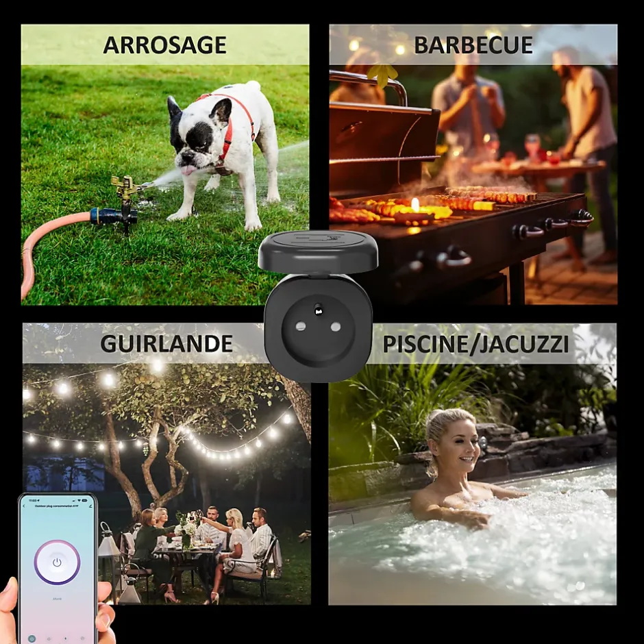 DescriptionApplication de contrôle : Smart Life / Tuya SmartTransmission réseau : Wi-Fi 2,4 GHz (IEEE 802.11 b/g/n)Puissance max. de transmission Wi-Fi : 0,6 WBande de fréquence Wi-Fi : 2400–2483,5 MHz (max. 20 dBm)Type de prise : FR (France / Type E)Tension de fonctionnement : 220–240 VPuissance maximale : 3680 WCourant : 16 AIndice de protection : IP44 (extérieur)Température de fonctionnement : -15 à 80 °CHumidité de fonctionnement : 40 % – 80 %Matériau : PC (polycarbonate)Dimensions : 118 × 75 × 72 mm IDÉAL POURJardin & terrasse : éclairages, pompes d’arrosage, guirlandes, barbecue électrique.Piscine & spa : pompes, filtres et accessoires nécessitant une gestion intelligente.Appareils puissants : chauffages extérieurs, électroménagers portatifs.Optimiser votre consommation énergétique grâce au suivi intégré.Automatiser vos usages extérieurs avec des scénarios programmés