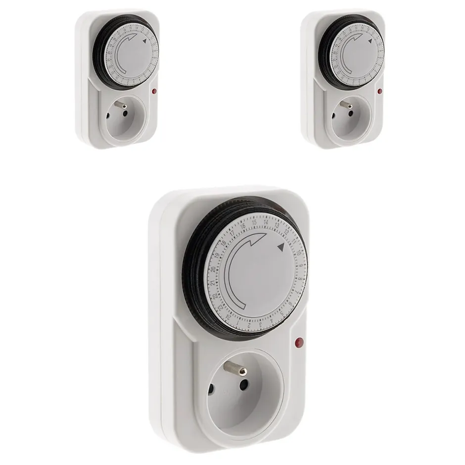 Programmateur journalier mécanique. Puissance maximale : 3500W. Intervalle de programmation : par tranches de 15 minutes. Indicateur lumineux : voyant de fonctionnement. Interrupteur intégré pour basculer entre mode automatique et manuel. Utilisation intérieure