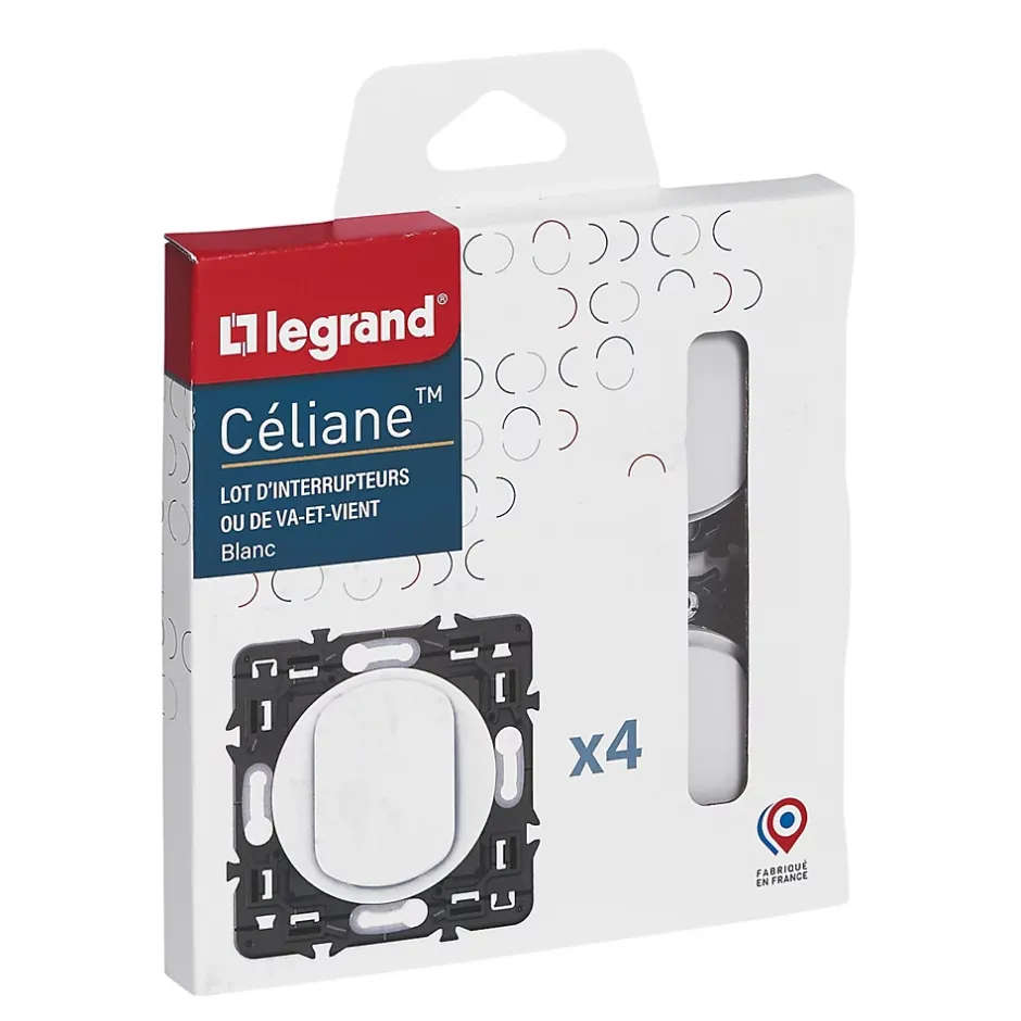 Lot 4 interrupteurs ou va-et-vient Céliane 10AX à bornes automatiques – livrés avec enjoliveurs Blanc et supports montés, à équiper de plaques de finition