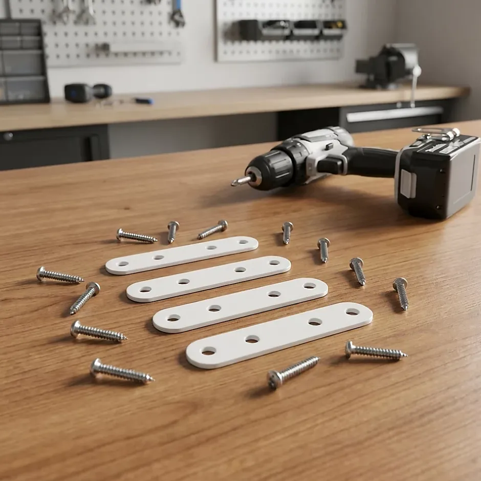 Lot de 4 pattes d’assemblage en acier blanc.