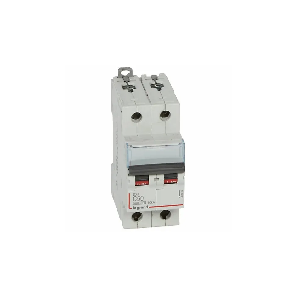 Disjoncteur Legrand bipolaire avec arrivée haute et départ bas à vis Ce disjoncteur 2P est fabriqué par Legrand. Il appartient à la gamme DX3.Dans le respect de la norme EN60947-2, il assure un pouvoir de coupure de 10kA (protection des circuits électriques tertiaires et industriels). Il assure également un pouvoir de coupure de 6kA pour être conforme à la norme EN60868-1 (protection des circuits électriques résidentiels).Ce disjoncteur est raccordé au circuit via un système de connexion à vis. Il occupe 2 modules de 18mm sur le rail DIN de votre tableau électrique.Calibré à 50A, le disjoncteur 407789 courbe C doit être installé sur un circuit de tension 380V.L’essentiel du disjoncteur Legrand 407789Courbe CPouvoir de coupure en habitation : 6kAPouvoir de coupure en industrie : 10kACalibrage : 50ATension nominale : 380V