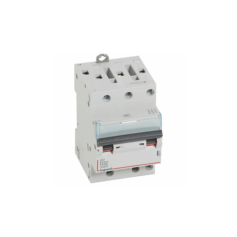 Disjoncteur Legrand triphasé avec arrivée haute et départ bas à vis pour peigne HX³ optimisé Ce disjoncteur 3P est fabriqué par Legrand. Il appartient à la gamme DX3.Dans le respect de la norme EN60947-2, il assure un pouvoir de coupure de 10kA (protection des circuits électriques tertiaires et industriels). Il assure également un pouvoir de coupure de 6kA pour être conforme à la norme EN60868-1 (protection des circuits électriques résidentiels).Ce disjoncteur est raccordé au circuit via un système de connexion à vis. Il occupe 3 modules de 18mm sur le rail DIN de votre tableau électrique.Calibré à 32A, le disjoncteur 408071 courbe D doit être installé sur un circuit de tension 380V.L’essentiel du disjoncteur Legrand 408071Courbe DPouvoir de coupure en habitation : 6kAPouvoir de coupure en industrie : 10kACalibrage : 32ATension nominale : 380V