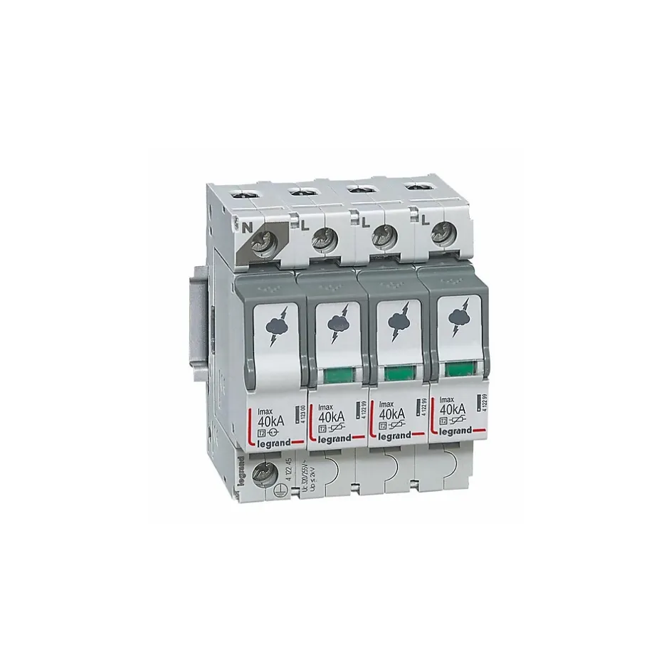Parafoudre triphasé + neutre Legrand 412245Ce parafoudre 3P+N de type 2 est installé en tête de tableau électrique quand l’installation n’inclut pas de paratonnerre. Il est positionné en aval du disjoncteur de branchement.Le parafoudre modulaire Legrand 412245 est un parafoudre sans disjoncteur intégré. Il doit être protégé par un disjoncteur tétrapolaire 25A courbe C. Cette protection assure la sécurité du circuit quand le parafoudre arrive en fin de vie (obligatoire selon NF C 15-100)Ce dispositif de protection contre la foudre inclut un indicateur d’état de fin de vie en façade du parafoudre. cet indicateur est vert quand le parafoudre est en fonction et il est en orange quand la cartouche est à remplacerCe parafoudre dispose d’un courant nominal de décharge de 20 kA . Il dispose également d’un courant max de décharge de 40kA, Cette valeur correspond à l’intensité max que peut écouler un parafoudre sur un choc de foudre.Ce dispositif est connecté au circuit par un système de connexion à vis.L’essentiel sur le parafoudre Legrand 412245Courant nominal de décharge In = 20 kACourant max de décharge Imax= 40kAType 2parafoudre auto protégé : NonReport de signalisation : OuiParafoudre débrochable (cartouches remplaçables)
