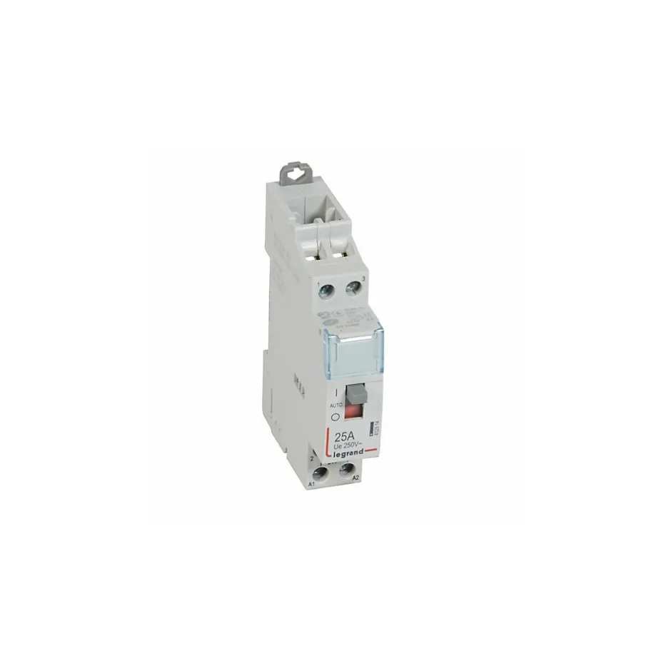 Contacteur de puissance CX³ commande manuelle bobine 24V~ – 2P 250V~ – 25A – contact 2F – 1 module Le contacteur jour nuit de la gamme CX3 est fabriqué par Legrand, il permet de mettre en marche votre chauffe eau en heures creuses (plage horaire où l’électricité est moins chères).Certifié NF, ce contacteur est équipé d’une bobine de tension 24Vca qui doit être protégée par un disjoncteur 2A conformément à la norme NF C 15-100.Le contacteur modulaire 412514 de chez Legrand est équipé de contacts à fermeture : 2F ou 2NO (contacts normalement ouverts).Le contacteur jour/nuit Legrand 412 est à commande manuelle, il intègre 3 positions visibles : AUTO, arrêt et marche forcée.Câblé via un système de bornes de raccordements à vis, ce contacteur jour/nuit occupe 1 module de 18mm sur le rail DIN du tableau de votre installation.Points clés du contacteur jour nuit Legrand 412514 : Certifié NFBobine de tension 24VcaContacts 2NOPositions AUTO / Arrêt / Marche forcée.Fonctionne en heures creuses.Protéger la bobine par un disjoncteur 2A.Bornes de raccordements à vis.