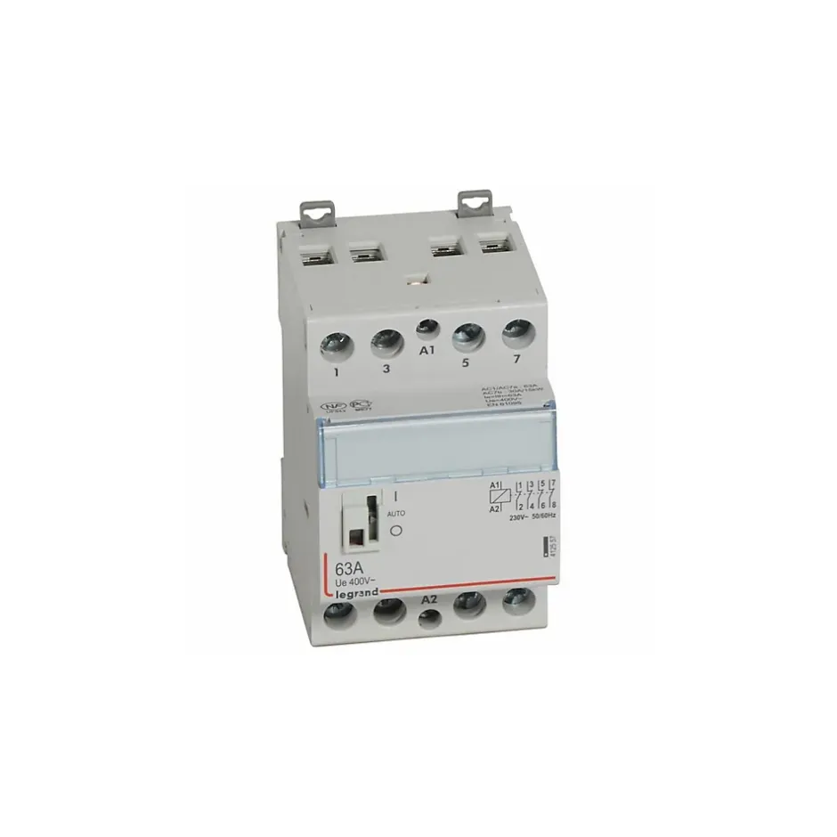 Contacteur de puissance CX³ bobine 230V~ – 4P 250V~ – 63A – contact 4O – 3 modules Le contacteur jour nuit de la gamme CX3 est fabriqué par Legrand, il permet de mettre en marche votre chauffe eau en heures creuses (plage horaire où l’électricité est moins chères).Certifié NF, ce contacteur est équipé d’une bobine de tension 230Vca qui doit être protégée par un disjoncteur 2A conformément à la norme NF C 15-100.Le contacteur modulaire 412557 de chez Legrand est équipé de contacts à ouverture : 4O ou 4NF (contacts normalement fermés).Ce contacteur Legrand 412 à commande manuelle intègre 3 positions visibles : AUTO, arrêt et marche forcée.Câblé via un système de bornes de raccordements à vis, ce contacteur jour/nuit triphasé occupe 3 modules de 18mm sur le rail DIN du tableau de votre installation.Points clés du contacteur jour nuit Legrand 412557 : Certifié NFBobine de tension 230VcaContacts 4NFPositions AUTO / Arrêt / Marche forcée.Fonctionne en heures creuses.Protéger la bobine par un disjoncteur 2A.Bornes de raccordements à vis.