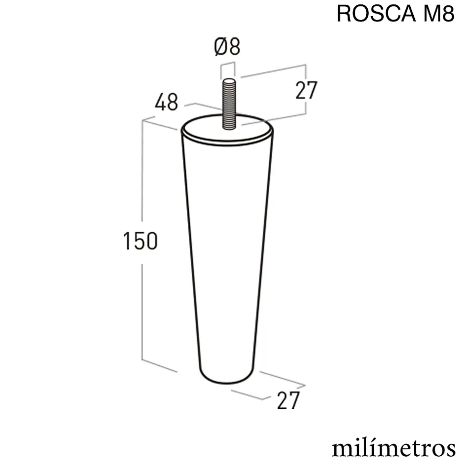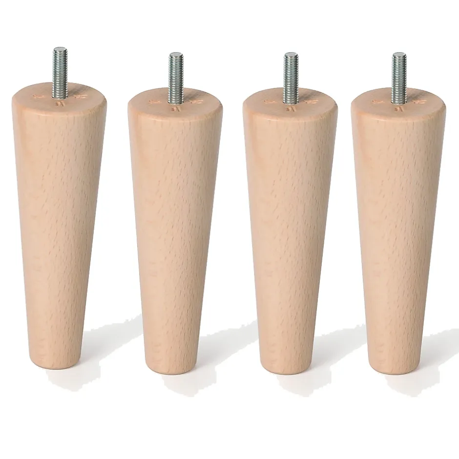 Pied de meuble nordique pied conique en bois de hêtre naturel non vernis. Hauteur 150mm. Le système d’ancrage au meuble utilise le goujon fileté M8 sur lequel le pied est inséré dans sa partie supérieure. Avant de choisir le modèle vous devrez mesurer la hauteur que vous souhaitez laisser entre le meuble et le sol, en pensant à son nettoyage. Le matériau de fabrication de ces pieds est du bois de hêtre massif.