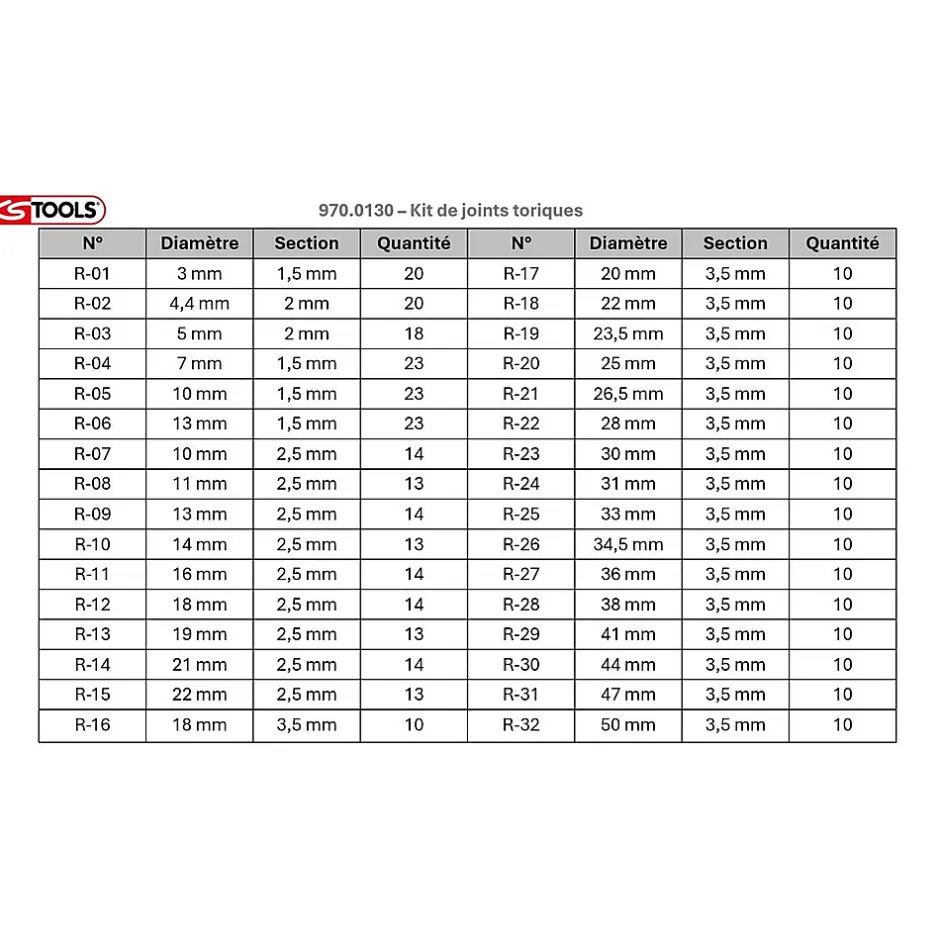 – Code EAN: 4042146478288- Diamètre en mm: 3 – 50 mm- Matière: Caoutchouc nitrile- Norme: DIN 3771- Statut produit: Actif- Pièces dans le set: 419 pièces- Poids: 630 g