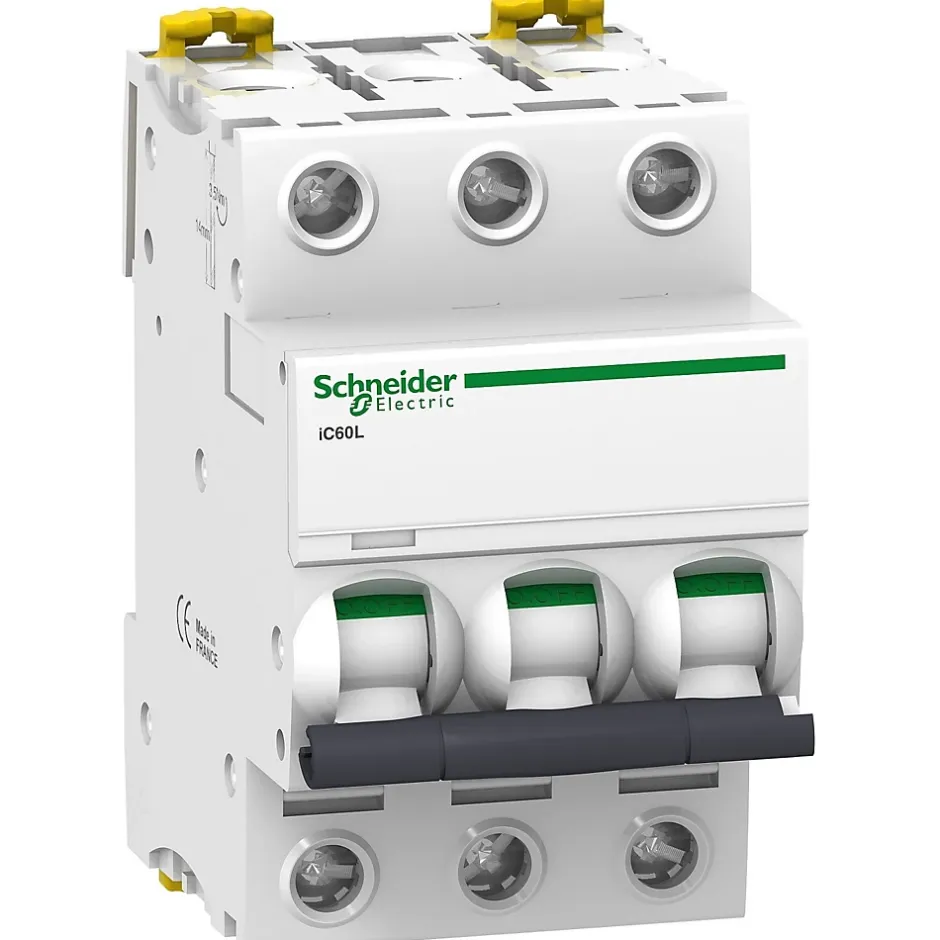 Disjoncteur 3P 63A courbe C – Schneider A9F94363Ce disjoncteur triphasé de Calibre 63A est équipé de bornes À vis d’une capacité de 1 à 35mm² en fil rigide et de 1 à 25mm² avec du fil souple avec embouts de câblage.Le disjoncteur Schneider A9F94363 est compatible avec des peignes électriques au pas de 18mm Issu de la gamme Acti 9 iC60L de chez Schneider, ce disjoncteur assure un pouvoir de coupure de 15kA selon la norme NF EN60947-2 (industriel et tertiaire) et 15kA selon la norme NF EN60898-1 (habitation).Le A9F94363 occupe 3 modules de 18mm sur votre tableau électrique.Ce disjoncteur magnétothermique est fabriqué en France par Schneider et bénéficie d’une certification CE.Les points clés du disjoncteur A9F94363certification CEFabriqué en Francecourbe CBornes À visFonctionne sur 380V triphaséCalibrage 63A