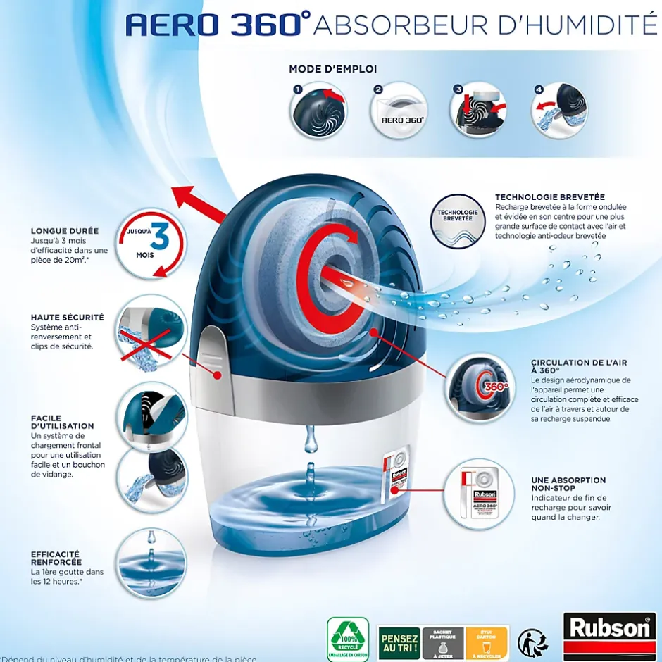 - Contenu de l’emballage – Rubson AERO 360° absorbeur d’humidité rechargeable, fabriqué à partir de 55% de plastique recyclé, anti moisissures et odeurs, contient 1 appareil et 1 recharge de 450 g.