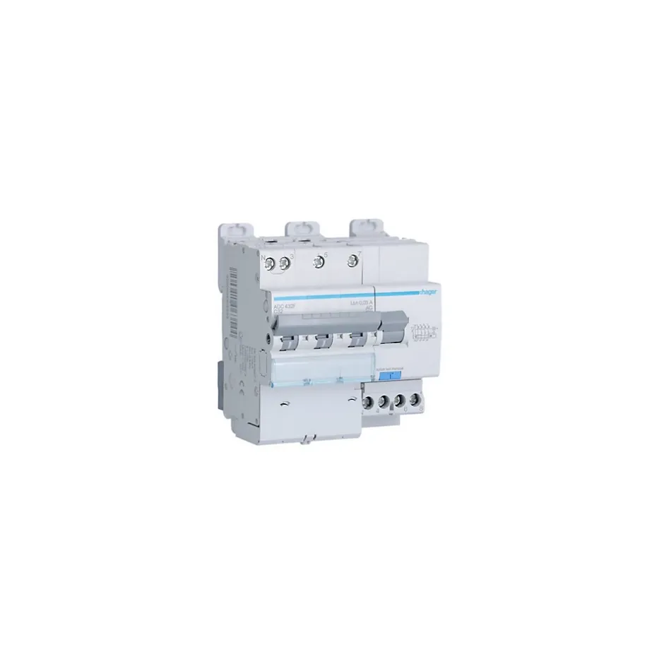 Disjoncteur différentiel à bornes décaléesCe disjoncteur différentiel fabriqué par Hager est clipsable sur le rail DIN de votre tableau électrique. Il est raccordé au circuit via un système de connexion à vis.De sensibilité 30mA, ce disjoncteur différentiel triphasé + neutre peut être installé pour protéger un circuit résidentiel selon la norme NF C 15-100.De calibre 32A ce disjoncteur différentiel assure un pouvoir de coupure de 6 kA.Ce disjoncteur différentiel est de type AC, il protège des circuits standards.Ce disjoncteur différentiel 3P+N est un disjoncteur courbe CLes points essentiels du disjoncteur différentiel Hager ADC432F3P+NCourbe CType ACPouvoir de coupure : 6 kASensibilité : 30mA (autorisé pour un usage résidentiel)