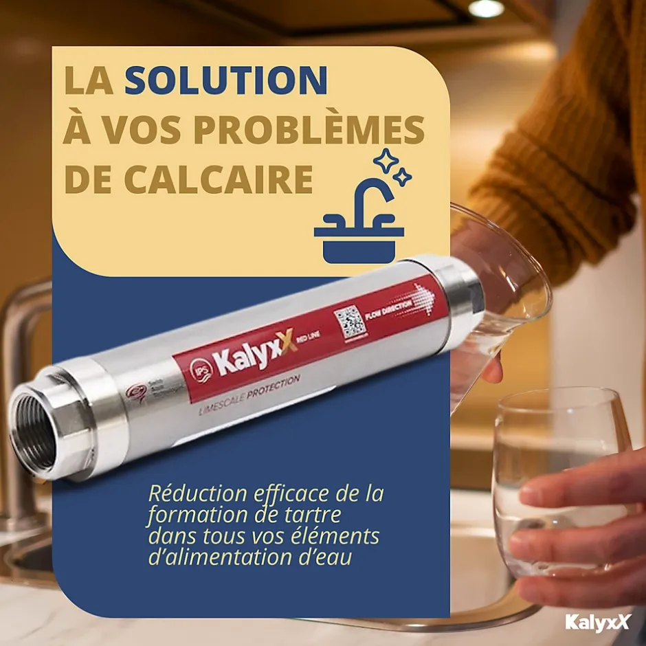 - Explorez IPS KalyxX : Un adoucisseur d’eau innovant et économique.L’IPS Kalyxx est un adoucisseur d’eau innovant qui modifie la structure du calcaire en le transformant de calcite en aragonite, une forme non-adhérente qui ne s’accumule pas. Grâce à sa technologie brevetée de Polarisation Galvanique Turbulente (TGP), il empêche les dépôts et obstructions tout en préservant les minéraux bénéfiques pour la santé. Sans utiliser de produits chimiques ni nécessiter d’énergie externe, l’IPS Kalyxx offre une solution durable et économique pour protéger vos équipements, vos canalisations et améliorer la qualité de l’eau.