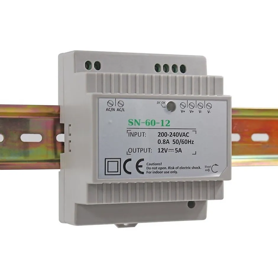 Cette alimentation modulaire s’installe sur un tableau électrique standard pour fournir une alimentation 12v – 5 A.Caractéristiques techniquesRéférence: SN-60-12Entrée: 200-240VAC 0,8A 50/60HzSortie: 12VDC-5AUsage intérieur: IP20Température de fonctionnement: -20°C à 60°CHumidité: 20-90%Poids:222gS’installe sur un rail de type TS35/7.5 et TS35/15Dimensions: 93mm (hauteur)x56mm(épaisseur)x78mm(largeur)Fiche technique