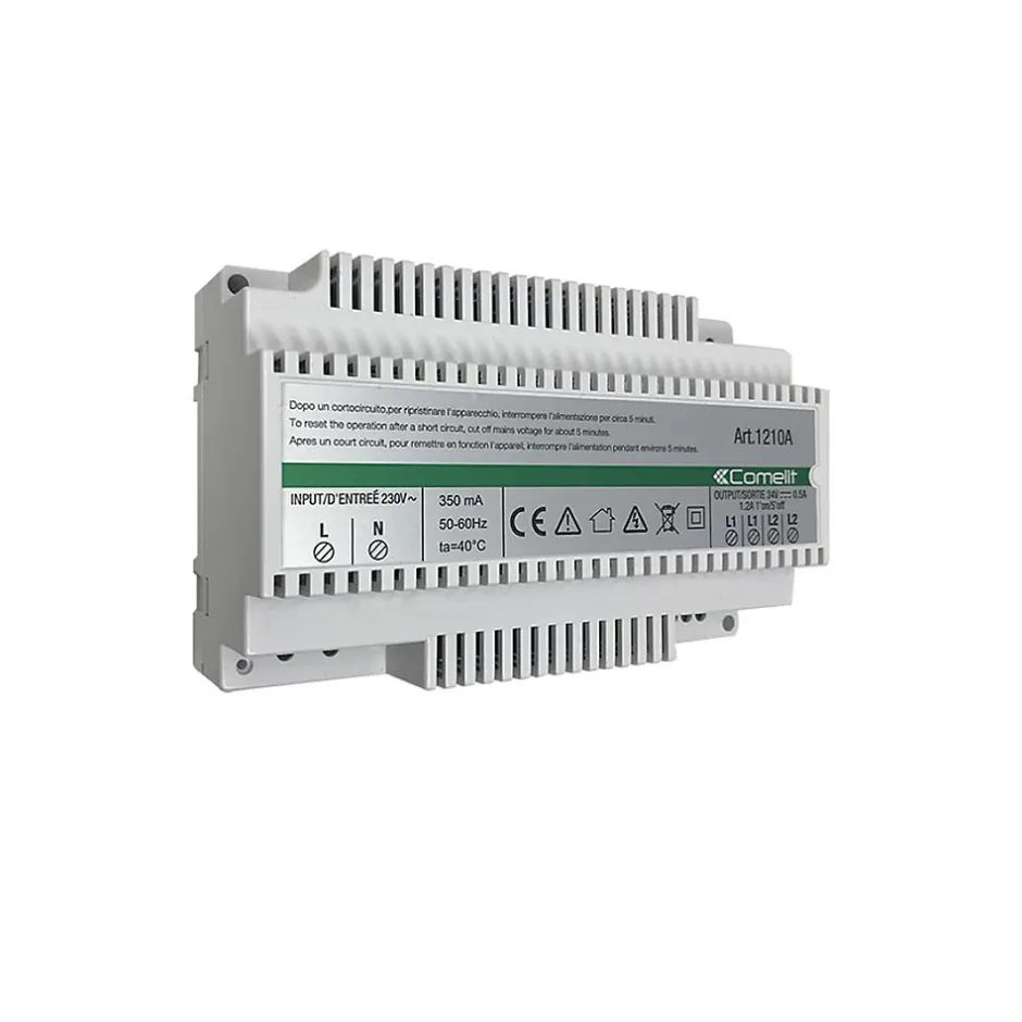 Alimentation simplebus2 – 1210A – ComelitLa marque Comelit propose l’alimentation simplebus2 -1210A pour fournir une énergie fiable et optimale à votre système audio/vidéo Simplebus 2. Le dispositif convertit efficacement l’électricité en une tension d’alimentation de sortie de 33VDC.Le modèle 1210A émet une alimentation stable pour assurer le bon fonctionnement de votre système audio/vidéo Simplebus 2. Vous aurez ainsi une communication audio et vidéo claire et fluide.Vous pouvez le monter en saillie sur une surface murale. Il peut être monté sur un rail DIN pour une intégration aisée. Ses dimensions correspondent à 8 modules DIN.Caractéristiques principales :Type d’accessoire : AlimentationMatière : PlastiqueCouleur : BlancTension d’alimentation : 230VAC/50÷60 HzTension d’alimentation de sortie : 33VDCNombre de modules DIN (n°) : 8Système audio/vidéo Simplebus 2 : OuiSystème audio Simplebus 2 : OuiMontage en saillie