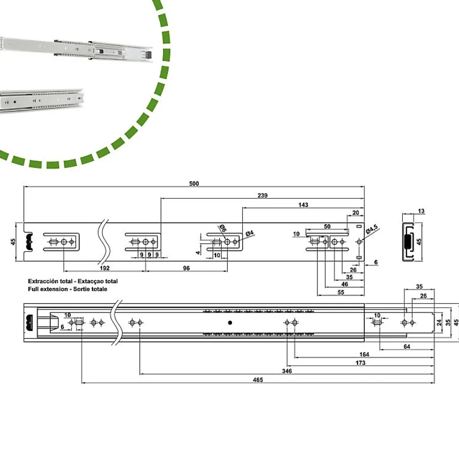 Coulisses à billes métalliques pour tiroirs à sortie totale. Avec roulements. Résistance: 30 kg/paire. Démontables.