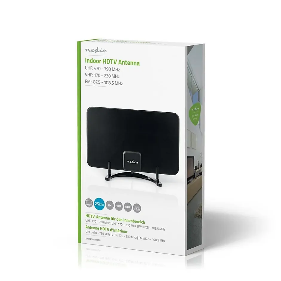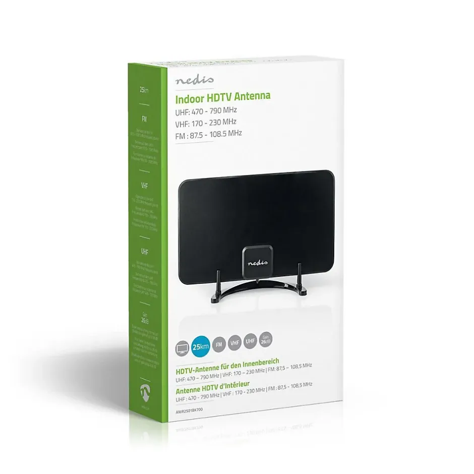 Description du produitThis indoor Nedis DVB-T/T2 antenna ensures a stable reception of free-to-air channels, pay television (if youre subscribed) and FM radio signals. The antenna features a compact and stylish design that blends in with any interior, without being too distracting.CaractéristiquesCette antenne d’intérieur DVB-T/T2 Nedis assure une réception stable des chaînes en clair, de la télévision payante (si vous souscrivez un abonnement) et des signaux de radio FM. L’antenne dispose d’une conception compacte et élégante qui s’intègre parfaitement à tous les intérieurs.Contenu de l’emballageAntenne Guide de démarrage rapide Adaptateur secteurSpécificationsConnexion (s) d’entrée d’alimentation de l’appareil: DC 3.5 x 8.0 x 15 mmCouleur: NoirFiche d’alimentation: Euro / Type C (CEE 7/16)Filtre LTE: LTE700Gain: 26 dBGain FM: 24 dBGain UHF: 26 dBGain VHF: 26 dBGamme de fréquences FM: 87.5-108.5 MHzGamme de fréquences UHF: 470-694 MHzGamme de fréquences VHF: 170-230 MHzGamme de réception: 0-25 kmImpédance: 75 OhmIntérieur/extérieur: IntérieurLargeur: 128.0 mmLargeur horizontale du faisceau: 85 °Largeur verticale du faisceau: 63 °Longueur de corde: 2.10 mLongueur du câble de l’adaptateur secteur: 1.50 mMatériau: ABSPoids: 229 gProfondeur: 0.5 mmSupport DAB +: OuiTaille: 228.0 mmTension d’entrée: 220 – 240 VACType d’antenne: ActifType de connecteur: (Coax) IEC MâleType de signal: FMType de signal: UHFType de signal: VHFType de source