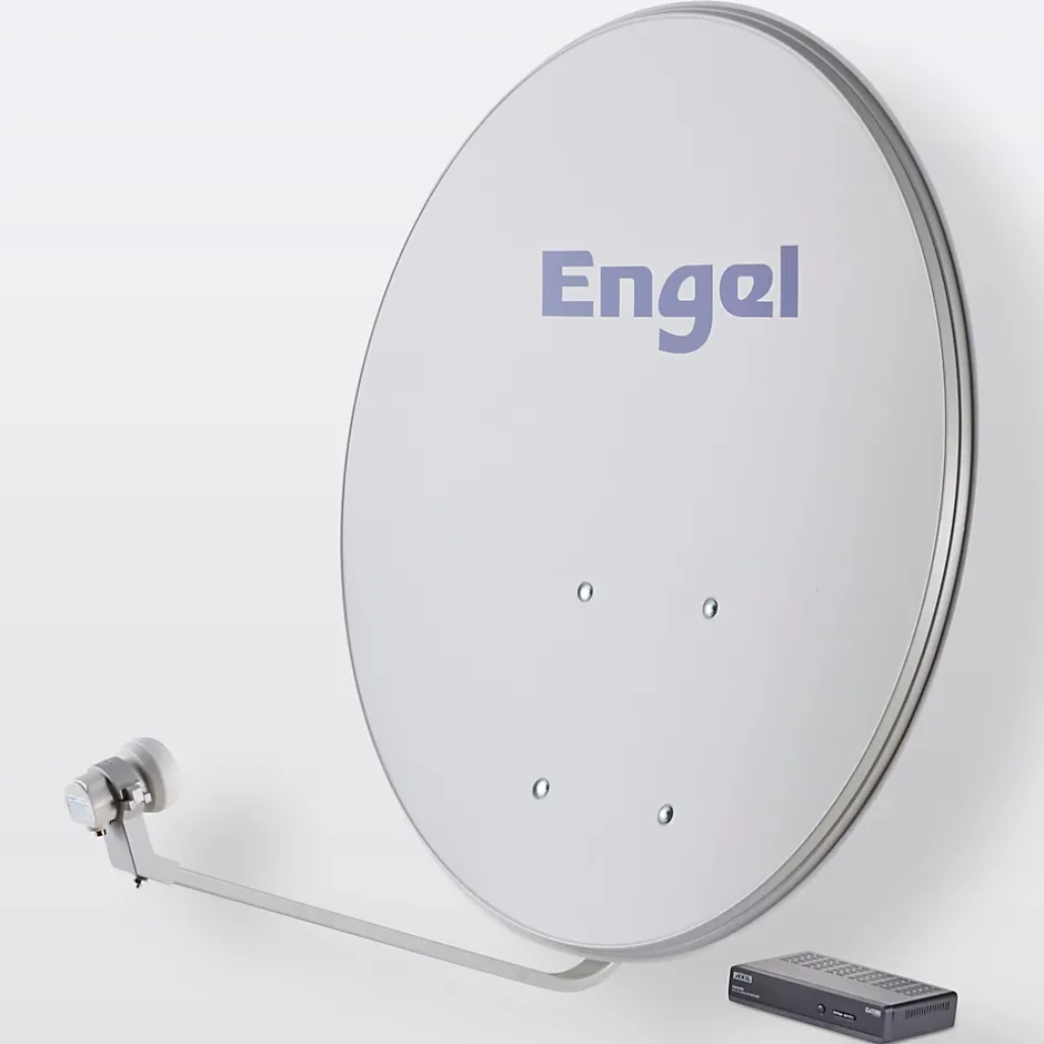 Kit satellite de 80 cm avec support arrière, câble et tête universelle (LNB) pour réception satellite en clair (FTA). Contient également un récepteur satellite en clair