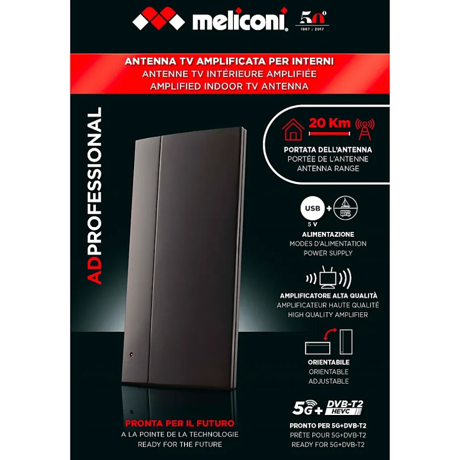 A la pointe de la technologie: l’antenne, qui est compatible avec les signaux numériques terrestres DVBT, est équipée de filtres anti-interférences 4G et 5G et est déjà configurée pour recevoir le DVBT2 HEVC.Portée de l’antenne: parfaite pour recevoir les signaux de répéteurs situés jusqu’à 20 km de distance.Qualité de l’amplificateur: circuit d’amplification interne à gain fixe de haute qualité (facteur de bruit = 1dB).Orientable: orientable horizontalement et verticalement pour une réception optimale du signal.Alimentation électrique: 5V via le câble USB fourni (à brancher sur la prise USB du téléviseur ou du décodeur). Il peut également être utilisé en vacances (caravane / camping / bateau).Compatibilité : Signaux DVB-T, DVB-T HD, DVB-T2 HEVC et DAB+ Radio. Portée de réception VHF + UHF (174~230 MHz 470~694 MHz)
