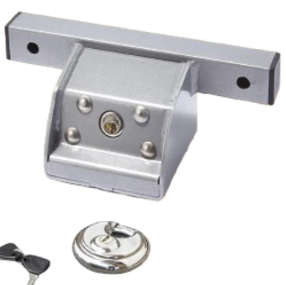 S’adapte à tout type de porte de garage Butoir extérieur fixé au sol par l’intermédiaire d’un sabot et verrouillé par un cadenas Diskus empêchant l’arrachement de la porte de garage Butoir extérieur peut être fixé sur les portes de garage s’ouvrant verticalement (sectionnelle, à enroulement, basculante sans débord) par l’intermédiaire de 2 boulons pour bloquer l’ouverture de ce type de portes Deux butées intérieures fixées au sol pour éviter l’enfoncement de la porte de garage Présence de 2 flasques latéraux protégeant le cadenas des chocs(coups de marteau,…). Les vis de fixation du sabot sont inaccessibles, cachées par le butoir et par la porte de garage. Le butoir est constitué d’un caisson fermé en tôle pour ne pas offrir de prise à un objet ou outil permettant de faire levier et ainsi éviter son arrachement