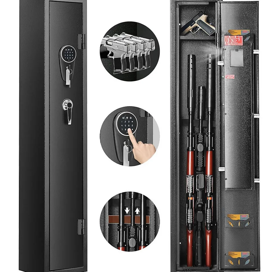 Verrouillage Intelligent par Mot de Passe : Le coffre-fort haut est équipé d’une serrure intelligente à mot de passe à 9 chiffres sur écran tactile qui sécurise votre arme à feu tout en vous permettant d’y accéder rapidement. Vous pouvez définir des codes de 3 à 12 chiffres et la serrure s’enclenche automatiquement lorsque la porte est fermée. Le coffre-fort pour fusils est également livré avec deux clés d’urgence et un boîtier de chargement externe.Grande Armoire pour Armes à Feu : Notre armoire-forte peut contenir jusqu’à trois fusils mesurant jusqu’à 122 cm, avec ou sans lunette de visée. Le porte-fusils est réglable et amovible, ce qui offre encore plus de flexibilité et de commodité. Elle comprend également un support pour 4 pistolets et trois coffres à balles pour vous aider à organiser toutes vos armes à feu et vos accessoires. Gardez vos armes à feu facilement accessibles et protégées grâce à notre armoire pour fusils.