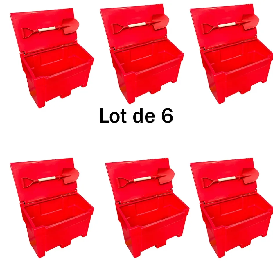 Bac à sable incendie, bac à sel de déneigement avec pelle d’une capacité de 200L en polyéthylène haute densité, traité anti UV.Des clips intégrés dans le couvercle permettent de fixer la pelle. Un passage de fourches est prévu pour faciliter la mobilité du bac.Pelle ronde , manche en bois, tête et poignée en acier forgé à chaud avec traitement thermique finition peinture rouge non polluante. Lot de 6 piècesCapacité : 200LLongueur : 98 cmHauteur : 69 cmLargeur : 50 cmPoids : 16,5 kgCouvercle pentuBac à sable incendie, bac à sel de déneigementMatière : polyéthylène haute densitéTrès résistant aux chocs, plage d’utilisation : -30°C à +60°C100% recyclableFabrication FrançaiseMarque : PLAST’UP ROTOMOULAGE