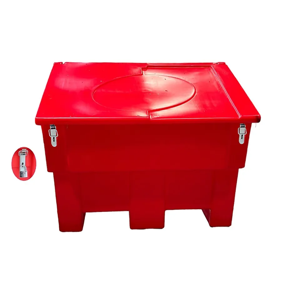 Bac à sable incendie/ à sel de déneigement avec 2 grenouillères et 2 cadenas d’une capacité de 300L en polyéthylène haute densité traité anti UV.Des clips intégrés dans le couvercle permettent de fixer une pelle (pelle non fournie). Un passage de fourches est prévu pour faciliter la mobilité du bac.Dans cette version, le bac est équipé de grenouillères cadenassées pour sécuriser le contenu du bac.Lot de 6 bacs.Capacité : 300LLongueur : 99 cmHauteur : 79 cmLargeur : 58.5 cmPoids : 19.5 kgCouvercle pentuPour stockage de sable incendie et sel deneigementMatière : polyéthylène haute densitéTrès résistant aux chocs. plage d’utilisation : -30°C à +60°C_100% recyclableFabrication FrançaiseMarque : PLAST’UP ROTOMOULAGE