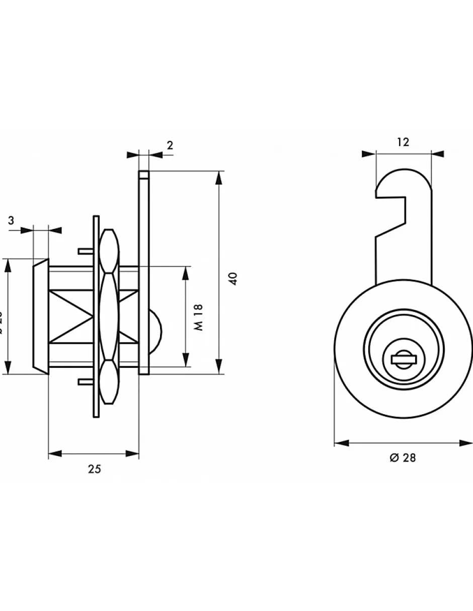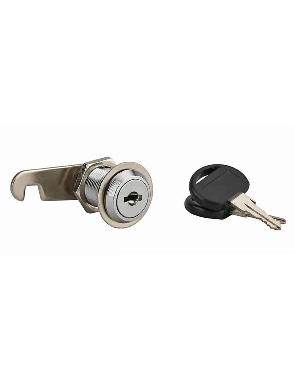 Corps alliage moulé. Mécanisme à paillettes. Came plate. 2 clés nickelées gainées PVC. Ecrou et griffe de fixation.
