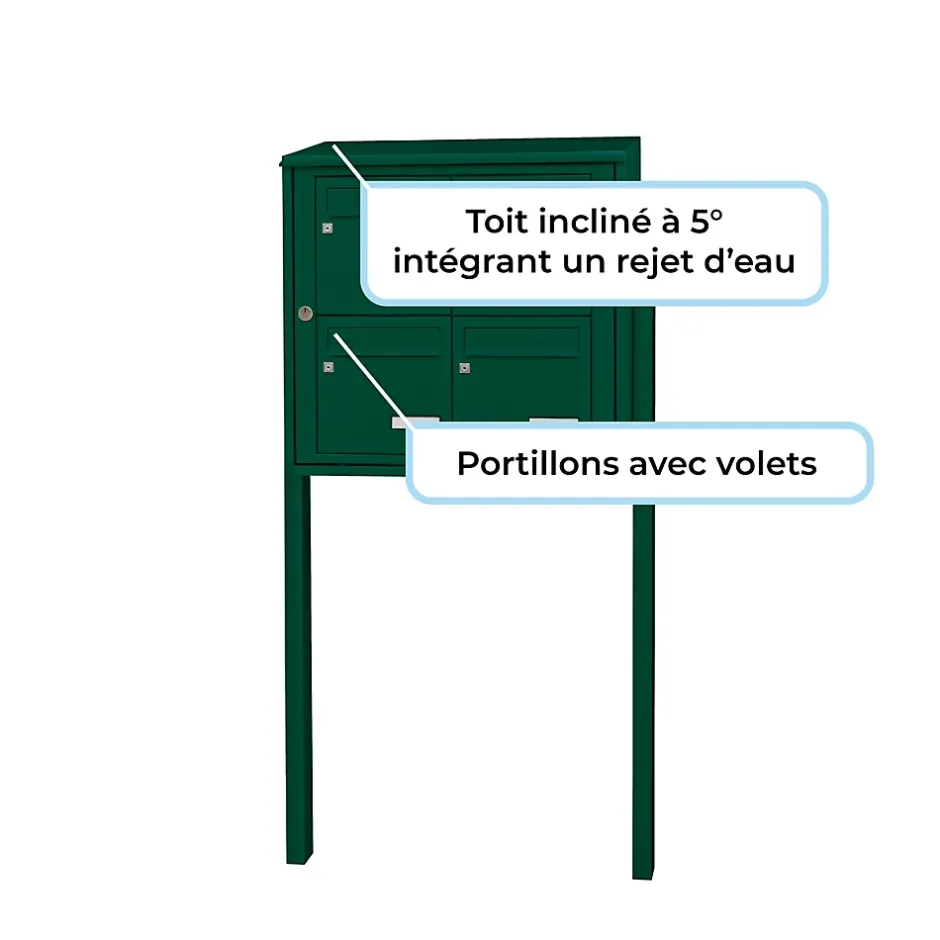 Bloc de boites aux lettres collectives, extérieur, sur pieds à sceller, normalisé, certifié loi handicap, à ouverture totale, conforme à la norme NF D27-405, antivandalisme grade 3. En tôle d’acier galvanisé, garantie anticorrosion 10 ans. Dimensions : 710x659x387mm. Portillons jointifs pour un gain de place. Toit incliné à 5° intégrant un rejet d’eau. Livré avec 2 pieds rectangulaires 80x40mm à sceller. Fermeture par serrure en zamak, came renforcée. Portillons avec volet embouti interchangeable, fente d’introduction avec herse antivol intégrée. Coffre et cloisons rigides, rivetés sans soudure.Disposition : 2 boites en largeur et 2 boites en hauteur. Peinture poudre polyester sans plomb. Porte nom affleurant en polycarbonate, dimensions 103x28mm. Tableau de clés fourni à l’intérieur du bloc, 2 clés fournies par boite. Le bloc de boites aux lettres est livré avec une serrure en laiton poli provisoire : ce système sert à maintenir le bloc fermé durant le transport et la pose. Il est obligatoire de le remplacer par une serrure définitive normalisée, fournie gratuitement par La Poste. Pour un immeuble neuf, la demande de raccordement postal est à faire après du bureau de poste local. En cas de rénovation, il suffit de récupérer la serrure normalisée La Poste installée sur le bloc remplacé. Bon à savoir : il existe 19 Pass La Poste différents, variables d’un quartier à un autre, selon la tournée du facteur.