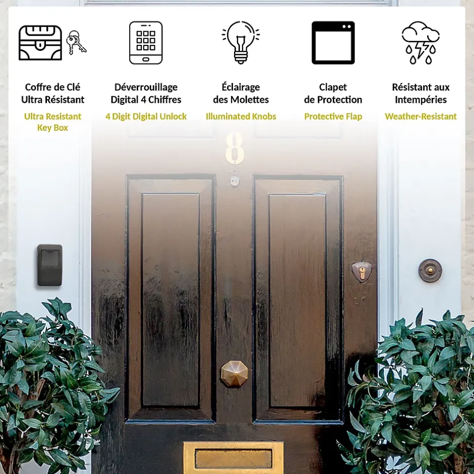 – BOÎTE A CLE AVEC CODE – Elle vous permet d’accéder à vos clés à tout moment et de manière sécurisée. Communiquez le code secret pour que chacun y accède : amis, parents, services à domicile, soignants, urgence, gardien, location ou colocation. – COFFRE A CLE HAUTE SECURITE – Sa combinaison à 4 chiffres permet jusqu’à 10 000 codes différents. Vous pouvez le changer à tout moment et facilement avec les roulettes intérieures. Le boîtier Lock peut être installé aussi bien à l’intérieur qu’à l’extérieur. Un kit est fourni pour une installation murale. – LUMIERE LED – Le boitier à clef offre un rangement pratique : Un aimant retient vos clés et évite qu’elles ne tombent à l’ouverture. Doté d’une LED, il éclaire les chiffres à la nuit tombée. Les chiffres peuvent être masqués à l’aide du clapet de fermeture qui rend le coffre discret et le protège des intempéries. – CONCEPTION DURABLE – Son boitier en alliage de zinc ultra résistant d’une épaisseur de 2mm assure une protection optimale. Le boîtier est monté sur charnière pour une manipulation pratique, sa base en caoutchouc permet à la fois de corriger les irrégularité du mur et renforce l’étanchéité du coffre. – CARACTERISTIQUES – Matière: Alliage zinc (2 mm), caoutchouc, plastique – Poids : 721 g – Dimensions Hors tout : 14.1 x 8.3 x 5.2 cm. – Dim utile du compartiment : 7.2 x 7.7 x 3.8 cm – Accessoires inclus : 4 vis, 4 chevilles, base en caoutchouc, 1 pile bouton CR 2032 (pour LED)