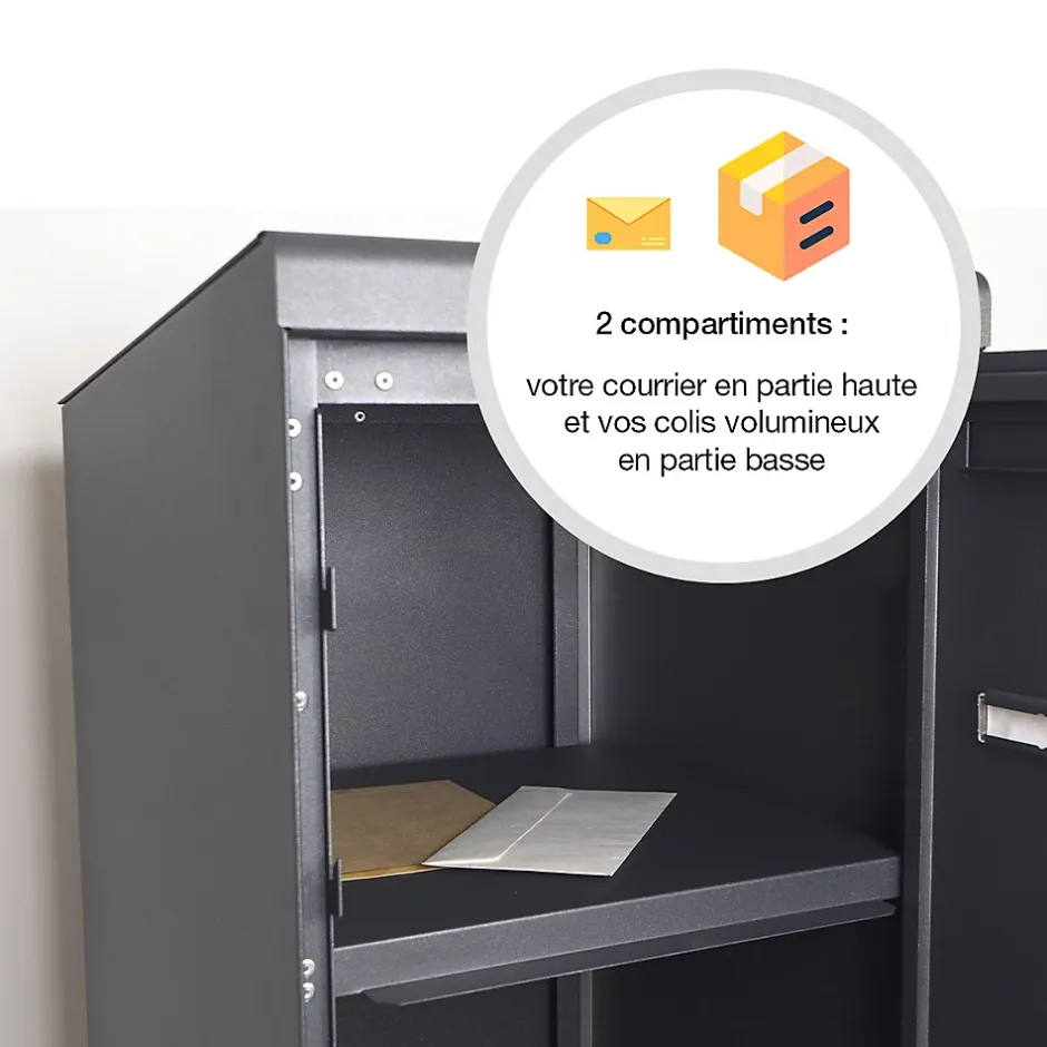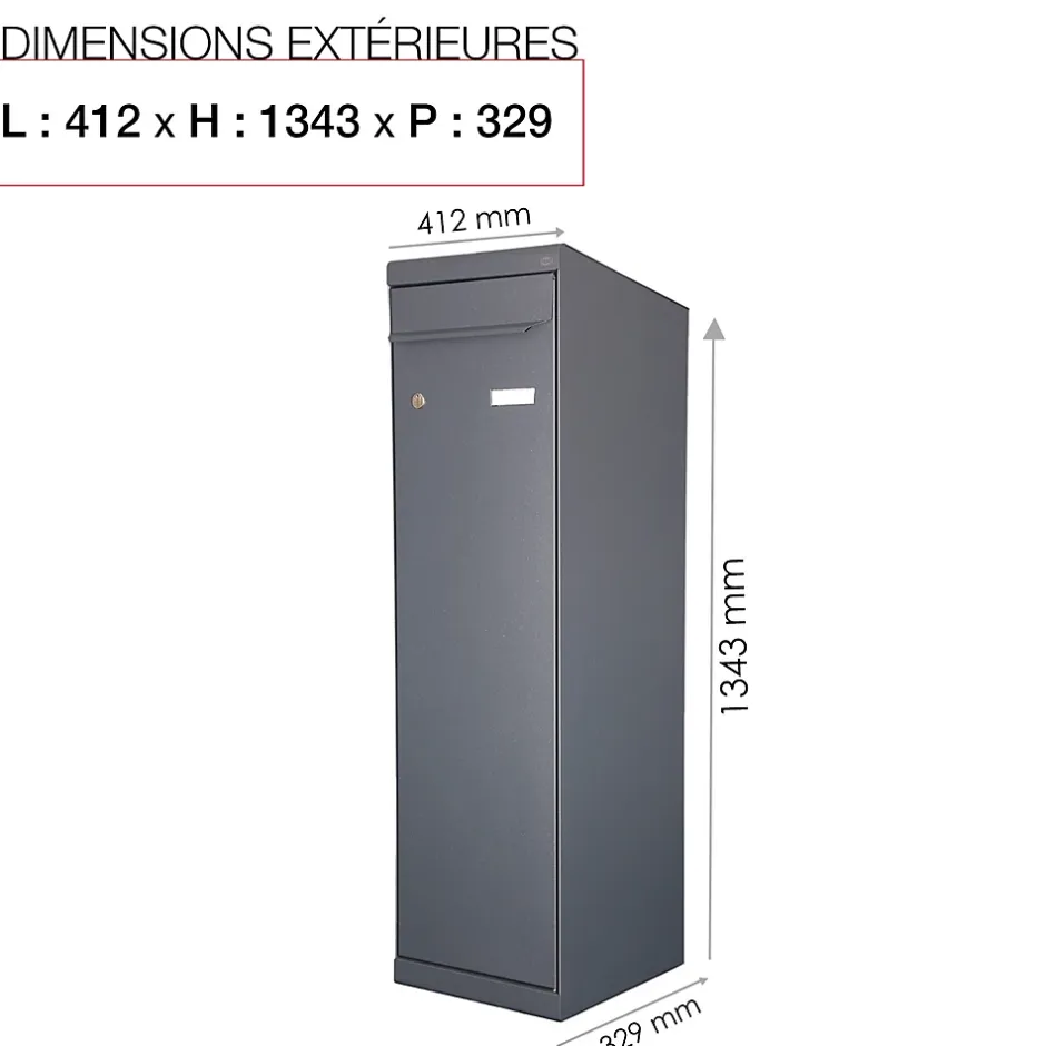 Produit sur-mesure : ce produit spécial est fabriqué à la commande. Boite aux lettres et à colis Twin L, normalisée. Corps en acier revêtu avec 2 compartiments permettant de recevoir votre courrier en partie haute et vos colis volumineux en partie basse. Pour recevoir tous vos colis, même volumineux à domicile sans se déplacer : de recevoir plus de 80% des colis issus du e-commerce. Sécurité renforcée, grâce à un système de fermeture par coulisse de verrouillage à 8 points d’ancrage, résistante à 150 kg d’arrachement. Porte en acier revêtu bi-métal, équipée d’une serrure normalisée et d’un volet doté de butées anti-bruit. Fond pré percé, facilitant la mise en place des accessoires de pose spécialement adaptés. Fixation muralee, au sol ou en encastrement. Dimensions intérieures (partie haute) : 340 x 265 x 258 mm – (partie basse) : 340 x 885 x 258 mm. Dimensions extérieures : 412 x 1343 x 472 mm.Boite à colis ingénieuse pour recevoir 80% des colis issus du e-commerce. Corps en acier revêtu avec 2 compartiments permettant de recevoir votre courrier en partie haute et vos colis volumineux en partie basse. Garantie anti-corrosion de 15 ans. Sécurité renforcée, grâce à un système de fermeture par coulisse de verrouillage à 8 points d’ancrage, résistante à 150 kg d’arrachement. Équipée d’une serrure normalisée et d’un volet doté de butées anti-bruit.Photos non contractuelles, se référer au RAL pour le coloris.