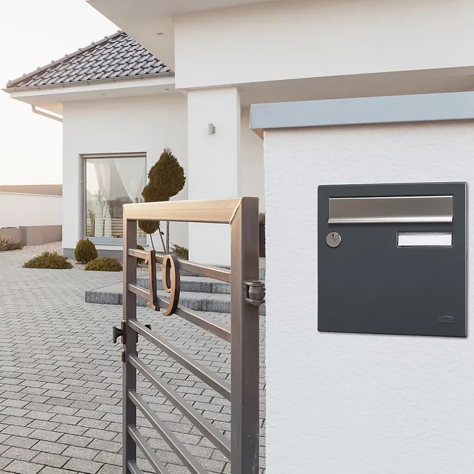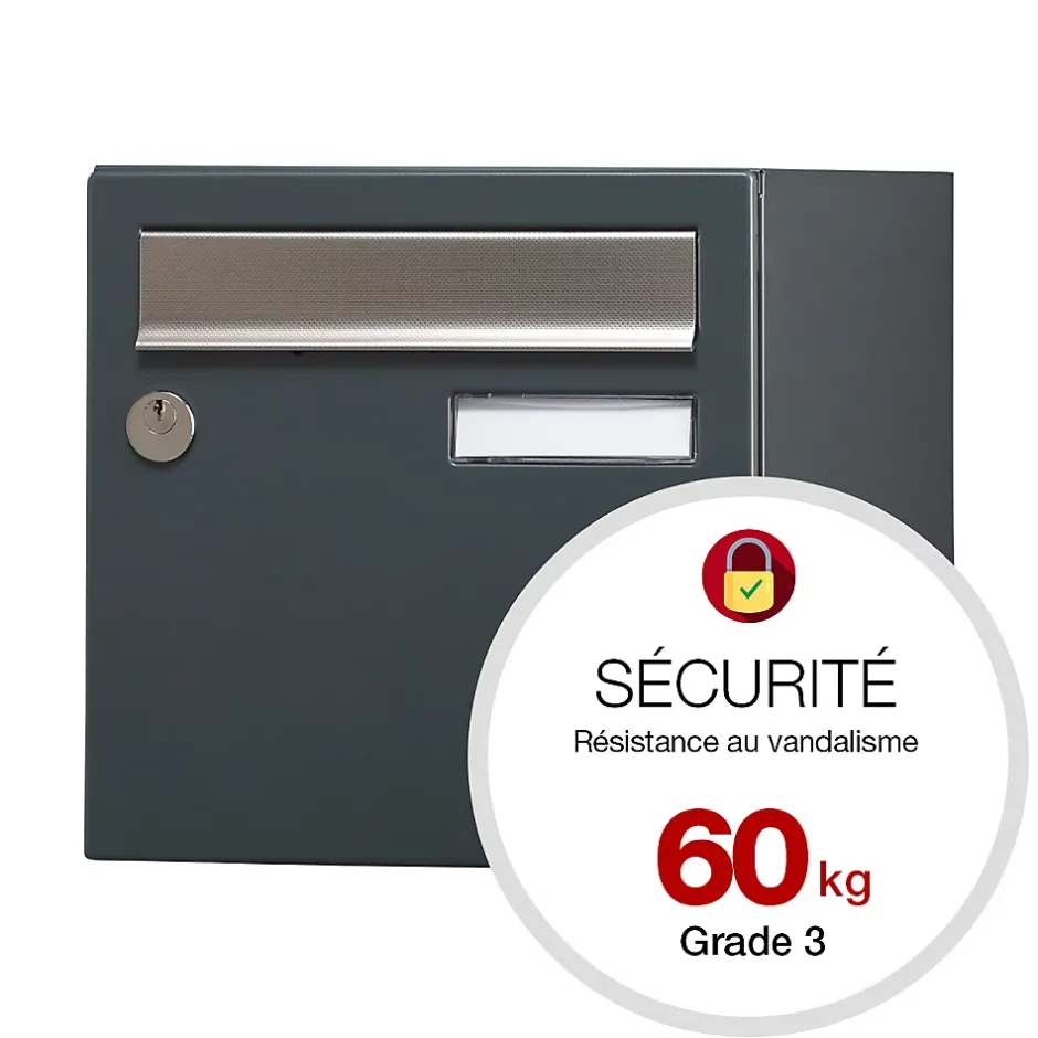Boite aux lettres normalisée 1 porte Renz Allure, design épuré. Permet de recevoir jusqu’à 45% des colis du e-commerce. Boitier avec gouttière hydrofuge, porte recouvrante équipée d’un volet en inox structuré amorti pour un meilleur confort acoustique, et d’un porte-nom affleurant en polycarbonate. Serrure normalisée avec 2 clés. Plancher ergonomique pour un retrait facile du courrier. Peinture poudre polyester sans plomb. Garantie anti-corrosion de 15 ans. Anti-vandale grade 3, résistant jusqu’à 60 kg d’arrachement. Certifiée loi handicap. Dimensions : 285x285x385mm.Apportez une touche d’élégance devant votre maison : optez pour la boite aux lettres Allure 1 porte, au design épuré et moderne. Allure est dotée d’un volet en inox structuré et amorti, qui permet d’offrir un bon confort acoustique. Sa gouttière hydrofuge permet de protéger efficacement votre courrier et vos colis même en cas de fortes pluies. Normalisée, la boite aux lettres Allure permet de réceptionner jusqu’à 45% des colis issus du e-commerce, directement chez vous. Elle dispose également d’un plancher ergonomique pour faciliter le retrait du courrier.Photos non contractuelles, se référer au RAL pour le coloris.