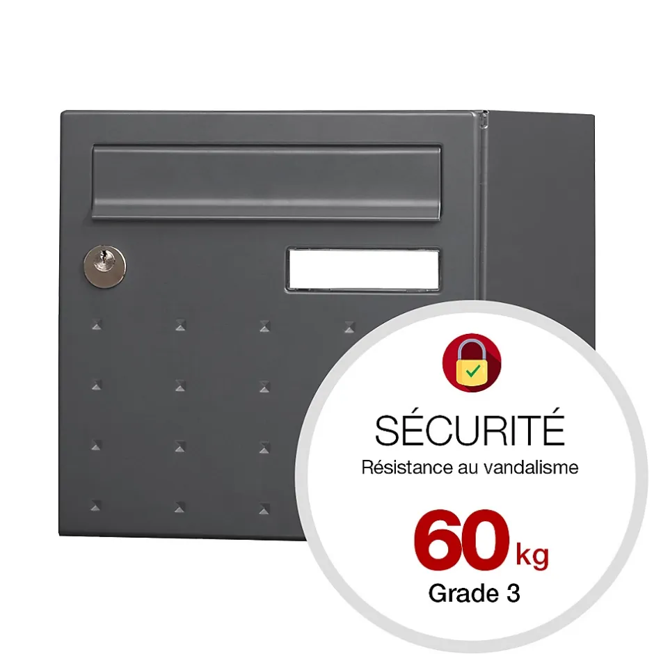 Produit sur-mesure : ce produit spécial est fabriqué à la commande. Boite aux lettres normalisée 1 porte Renz CubYsm avec décor. Permet de recevoir jusqu’à 45% des colis du e-commerce. Boitier avec gouttière hydrofuge permettant de maintenir le courrier au sec. Porte recouvrante équipée d’un volet acier avec atténuation de bruit pour un meilleur confort acoustique et d’un porte-nom affleurant en polycarbonate. Serrure normalisée avec 2 clés. Plancher ergonomique pour un retrait facile du courrier. Peinture poudre polyester sans plomb. Garantie anti-corrosion de 15 ans. Anti-vandale grade 3, résistant jusqu’à 60 kg d’arrachement. Certifiée loi handicap. Dimensions : 285x285x385mmLa boite aux lettres CubYsm bénéficie d’un design moderne en pointe de diamant. Pour protéger efficacement votre courrier contre les intempéries, elle dispose d’une gouttière hydrofuge et d’une porte recouvrante avec un volet. Ce dernier est amorti pour un meilleur confort acoustique à son ouverture et à sa fermeture. CubYsm est normalisée est permet de réceptionner votre courrier et des petits & moyens colis. De plus, son plancher ergonomique facilite le retrait du courrier.Photos non contractuelles, se référer au RAL pour le coloris.