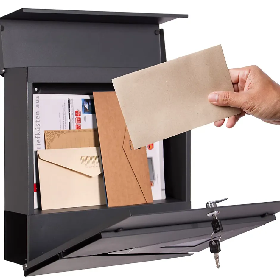 Description du produit :Le courrier est rangé en toute sécurité dans cette boîte aux lettres moderne. Dans cette boîte aux lettres, ton courrier sera à l’avenir rangé au sec et proprement. Grâce à l’introduction protégée par le clapet entièrement fermé, aucune humidité ou saleté ne peut pénétrer dans la boîte aux lettres. De plus, la boîte aux lettres est verrouillée par une serrure à cylindre. Cette boîte aux lettres ne peut pas seulement recevoir du courrier, mais aussi tes journaux, qui trouveront leur place dans le compartiment à journaux intégré.Cette boîte aux lettres ne séduit pas seulement par ses fonctions, mais aussi par sa façade unique en marbre noir. Fabriquée en acier revêtu par poudre, la boîte aux lettres résiste aux intempéries.Contenu de la livraison :1 x boîte aux lettres1 x kit de montage2 x clés