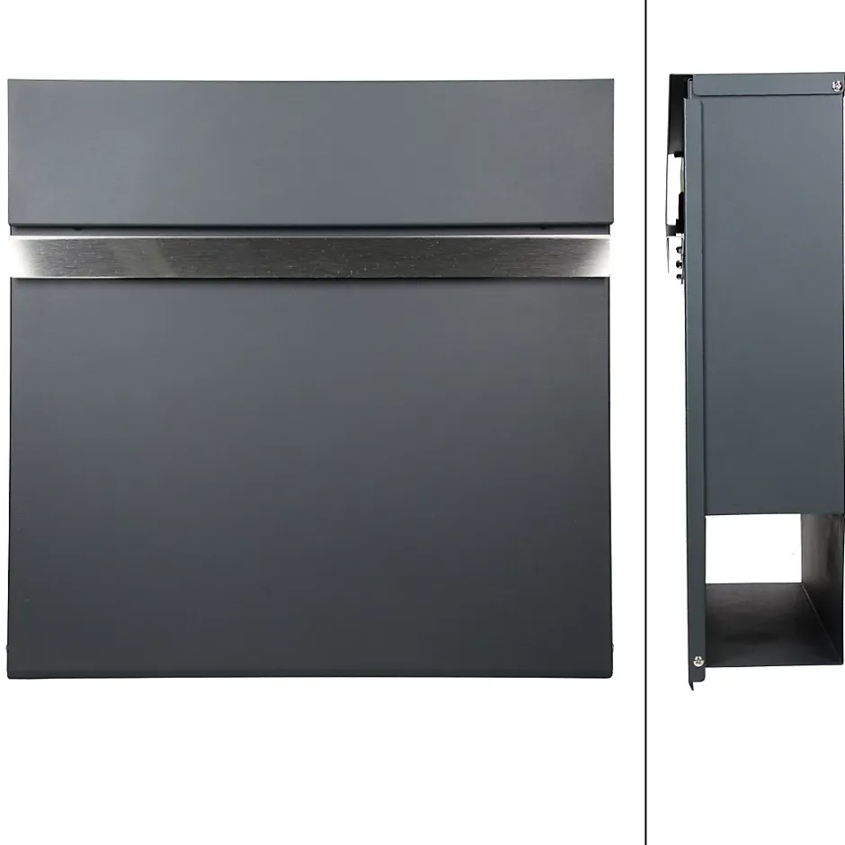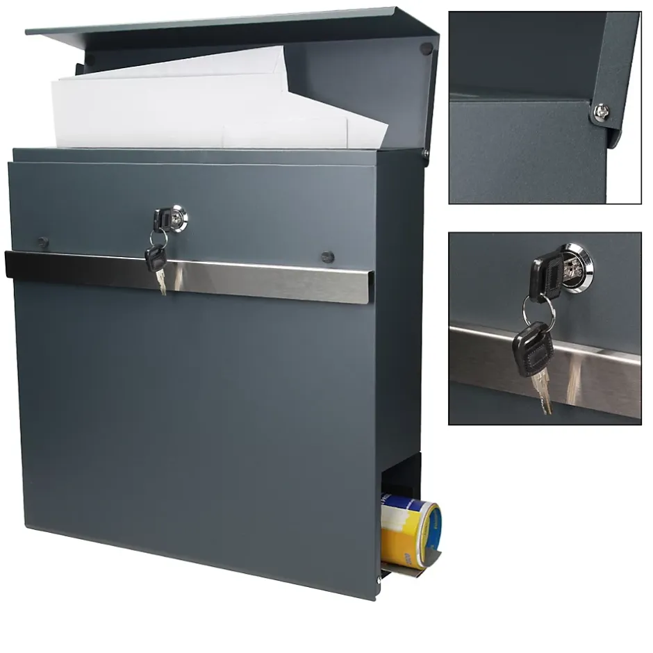 Description du produit :Ces boîtes aux lettres d’ECD Germany en acier robuste et thermolaqué convainquent par leur design moderne et protègent efficacement votre courrier contre l’humidité et la saleté.La grande boîte aux lettres, que vous pouvez verrouiller en toute sécurité avec les deux clés fournies, est particulièrement pratique. D’autres avantages sont le rouleau de journaux intégré et l’ouverture généreuse pour l’insertion des journaux.Propriétés :Boîte aux lettres en acier thermolaqué avec tube à journauxGrande mise à dispositionMontage simpleSerrure à cylindre comprenant 2 clés pour la sécurité de votre courrierY compris le matériel de montageÉtendue de la prestation :1 x boîte aux lettres en acier thermolaqué2 x cléMatériel de montage inclus