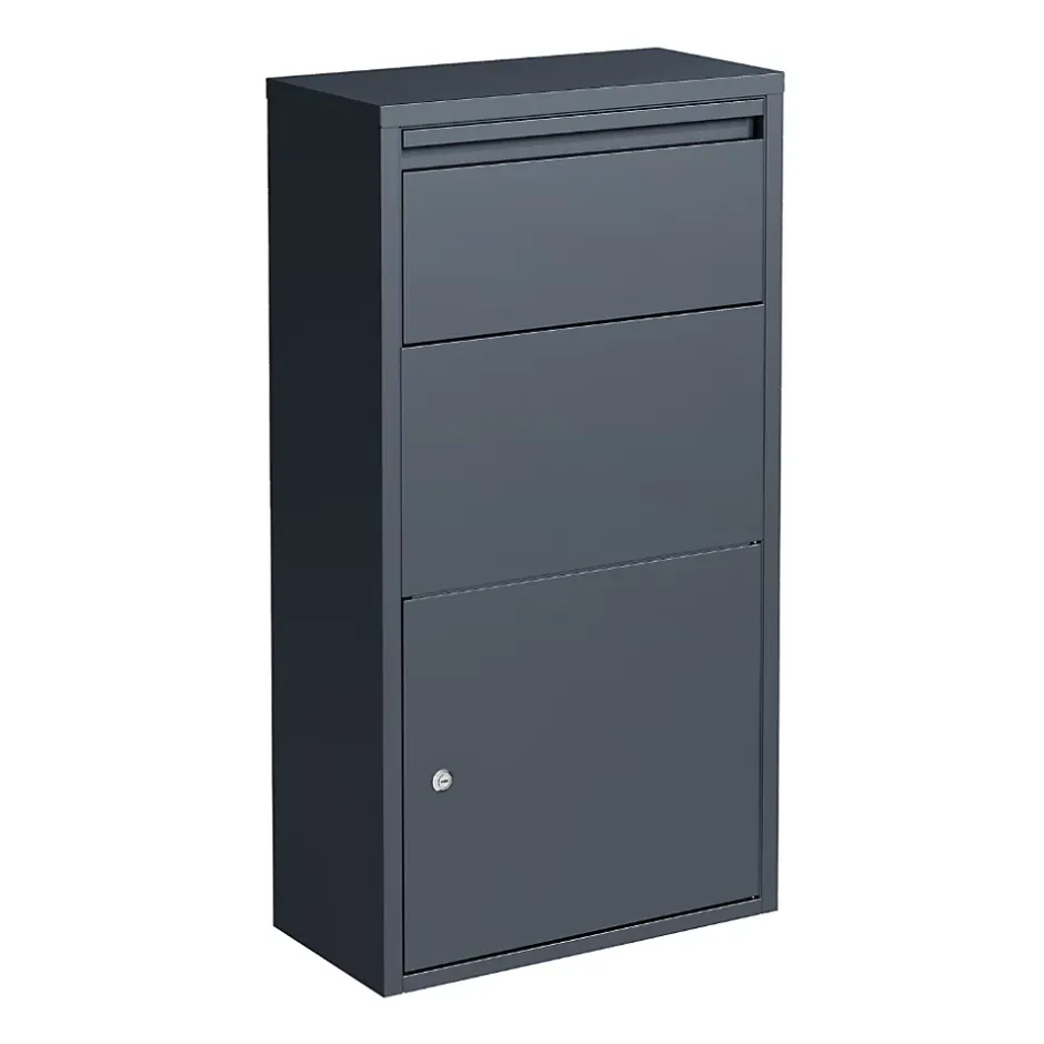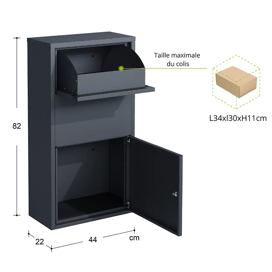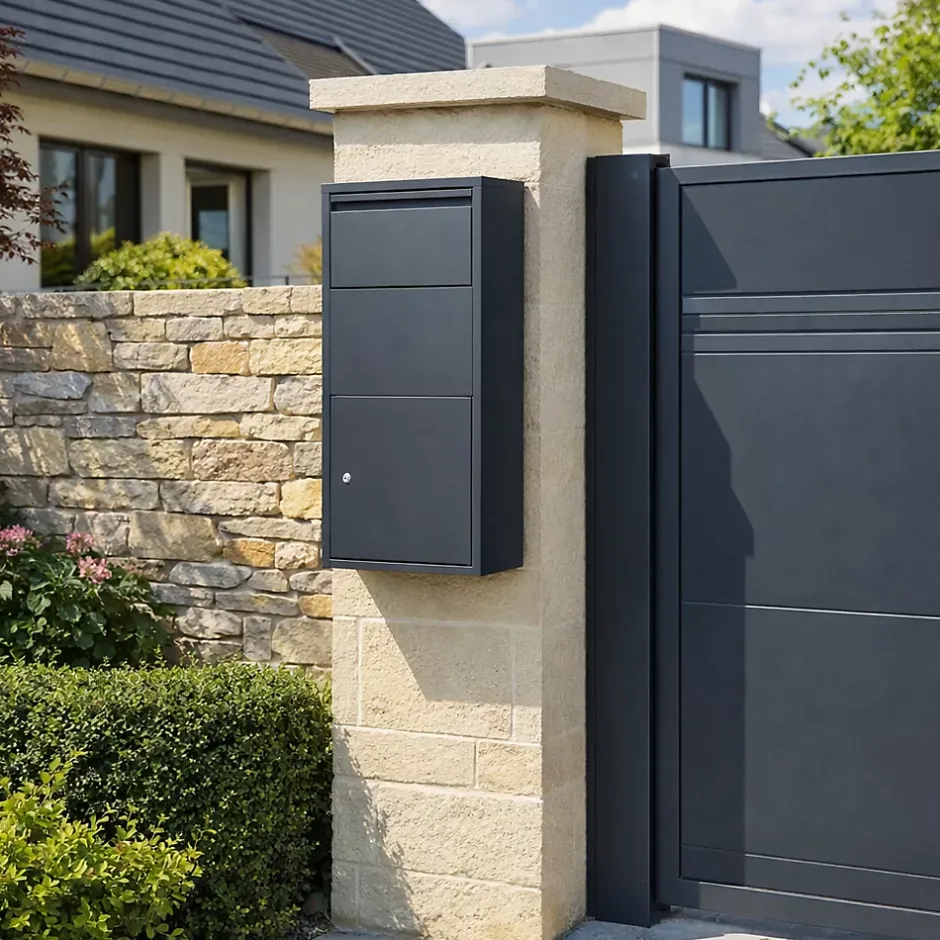 Cette boîte aux lettres murale en acier galvanisé est idéale pour équiper une façade avec une solution à la fois pratique et esthétique. Sa conception robuste associée à une finition gris époxy lui garantit une intégration discrète et moderne. Compacte mais fonctionnelle, elle accueille facilement le courrier, magazines et petits plis.Elle dispose d’une serrure à cylindre et d’une double ouverture (courrier et colis), offrant un accès plus pratique et une sécurité renforcée. La gâche de 2 mm et la porte de 0,8 mm d’épaisseur assurent une fermeture fiable et durable.Livrée avec deux clés et la visserie nécessaire, elle s’installe rapidement pour un usage immédiat. Dimensions : L44xl22xh82cm. Livré monté.