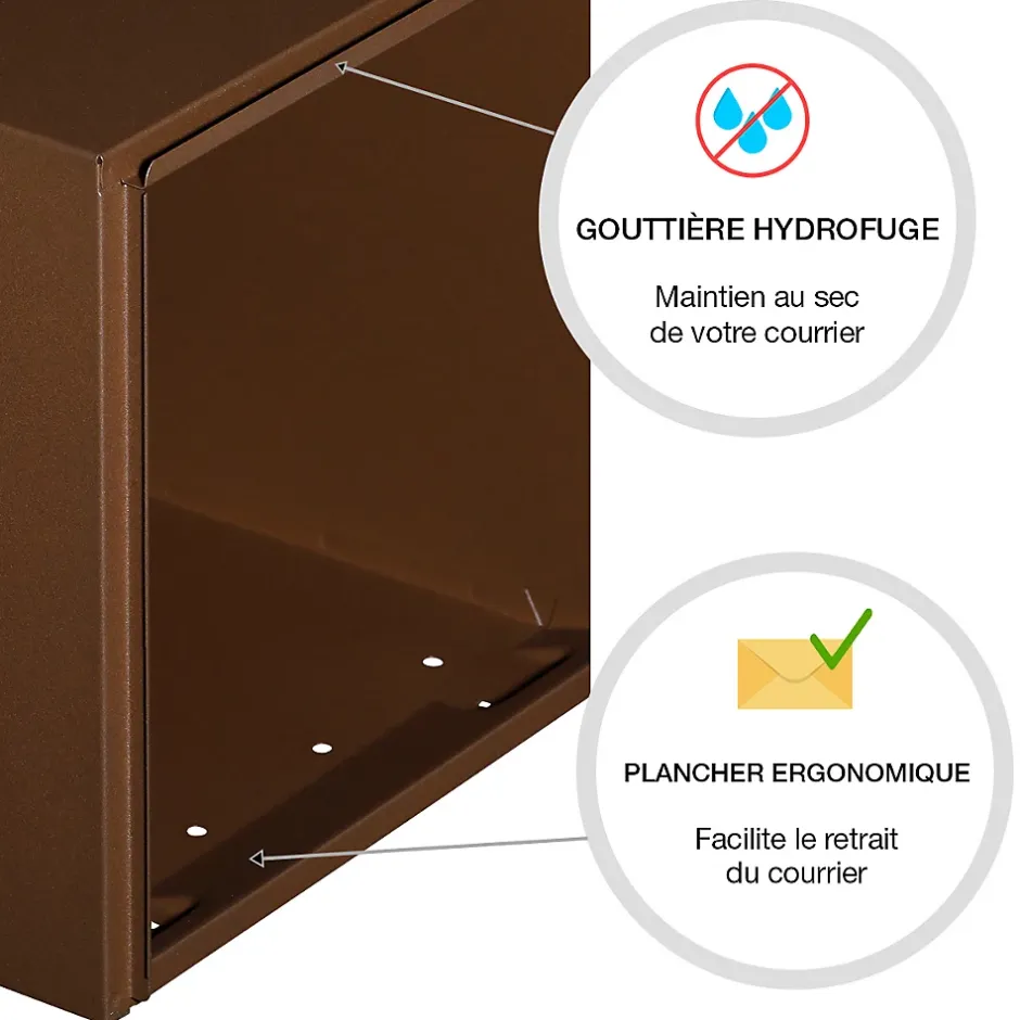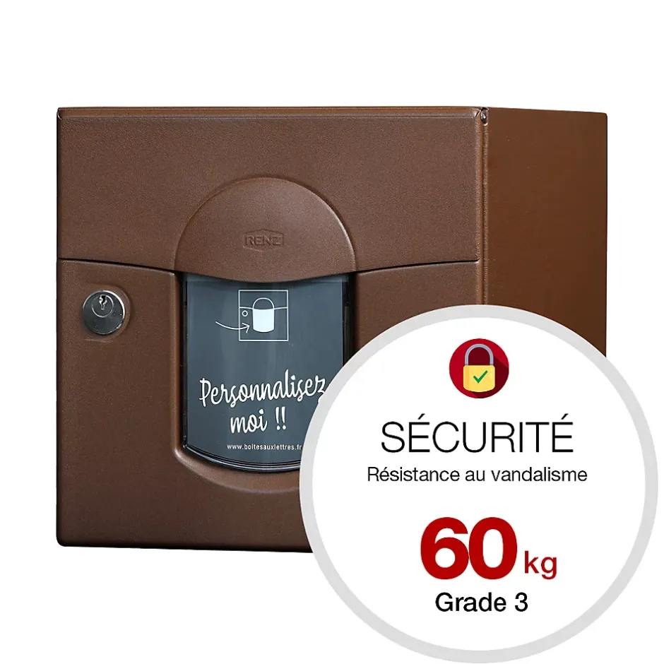 Produit sur-mesure : ce produit spécial est fabriqué à la commande. Boite aux lettres normalisée 1 porte Renz Soléa aux lignes courbes. Boitier avec gouttière hydrofuge. Porte avant galbée, avec large volet recouvrant et grand porte-nom personnalisable sur le site de RENZ dès réception de votre boite. Plancher ergonomique pour un retrait facile du courrier. Serrure agréée La Poste. Fond pré percé, facilitant la mise en place des accessoires de pose spécialement adaptés. Herse antivol renforcée. Peinture poudre polyester sans plomb. Garantie anti-corrosion de 15 ans. Anti-vandale grade 3, résistant jusqu’à 60kg d’arrachement. Certifiée loi handicap. Dimensions : 285x285x400mm. Boite aux lettres éco-conçue, tout a été étudié pour diminuer au maximum son empreinte sur l’environnement.La boite aux lettres Soléa 1 porte bénéficie d’un cycle de fabrication qui réduit au maximum son impact sur l’environnement. Avec une garantie anti-corrosion de 15 ans, elle offre une durabilité exceptionnelle. Soléa possède un design unique et original, grâce à une porte galbée et un large volet aux lignes courbes. Vous avez la possibilité de personnaliser l’étiquette de son large porte-nom. Son plancher ergonomique facilite la récupération de votre courrier. Elle est également équipée d’un fond pré-percé pour faciliter l’installation de votre boite. Sa capacité de réception permet de réceptionner du courrier, ainsi que des petits & moyens colis.Photos non contractuelles, se référer au RAL pour le coloris.