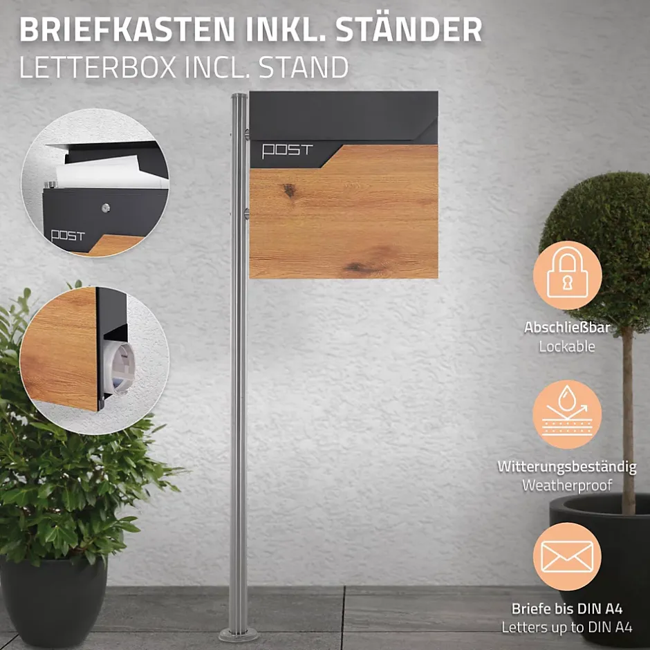 Description du produit :Boîte aux lettresCes boîtes aux lettres de ML-Design en acier inoxydable robuste et revêtu par poudre convainquent par leur design moderne et protègent ton courrier de manière fiable contre l’humidité et la saleté. Le revêtement de haute qualité est particulièrement durable et facile à entretenir et te garantit une utilisation sans problème.Le grand casier à courrier, que tu peux fermer en toute sécurité à l’aide des deux clés fournies, est particulièrement pratique. D’autres avantages sont le rouleau à journaux intégré ainsi que la grande ouverture d’introduction.SupportSupport de boîte aux lettres pratique de ML-Design. Grâce au support de boîte aux lettres, tu n’as pas besoin de percer des trous sur la façade de ta maison. Des ancrages au sol adaptés sont fournis pour fixer rapidement et facilement le support de boîte aux lettres dans le sol. Tu n’auras ainsi aucun problème de fixation.Le support de boîte aux lettres est fabriqué en acier de haute qualité et bien fini, ce qui lui confère une grande longévité. L’acier inoxydable revêtu par poudre résiste au vent et aux intempéries et ne rouille pas. Tu peux facilement combiner le support de boîte aux lettres avec une boîte aux lettres de ton choix.Contenu de la livraison :1 x support de boîte aux lettres, y compris 3 ancrages au sol et instructions de montage1 x boîte aux lettres avec kit d’accessoires (y compris 2 clés, entretoise, matériel de montage)