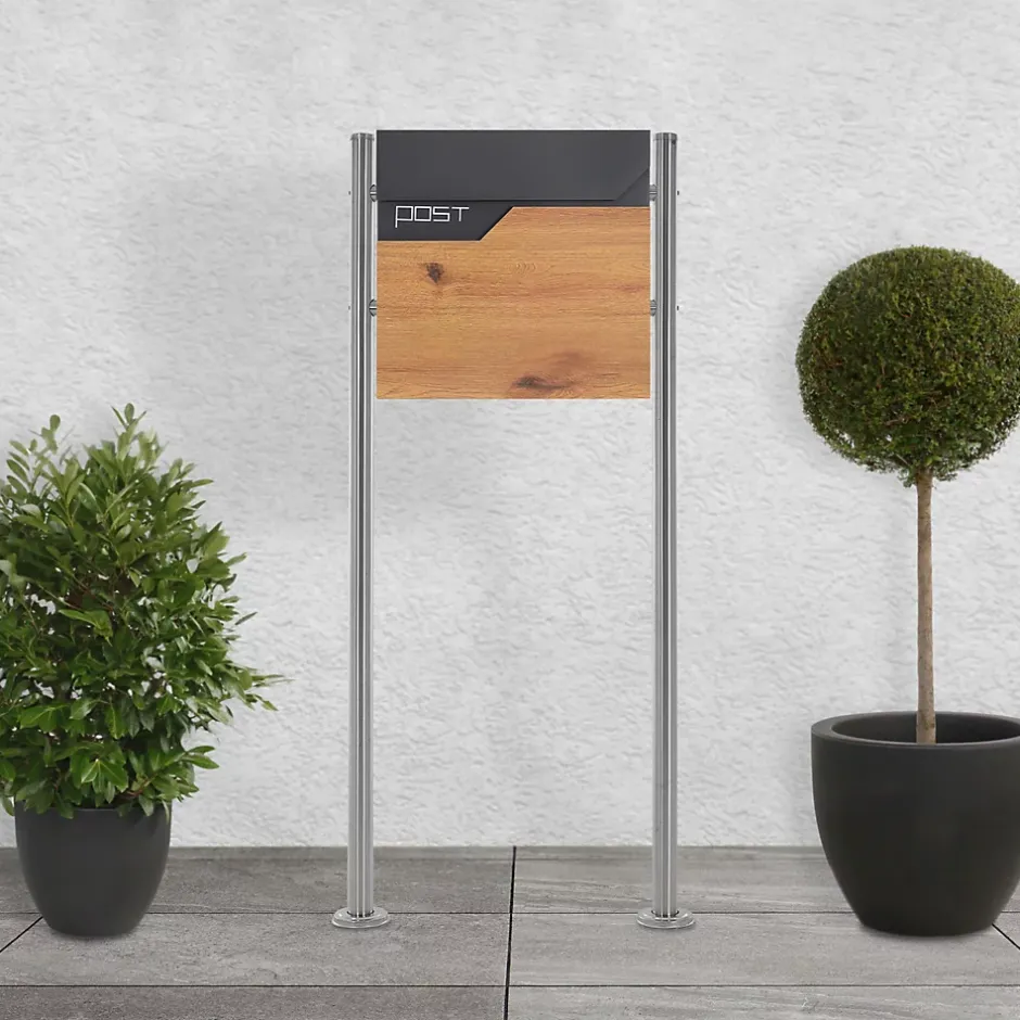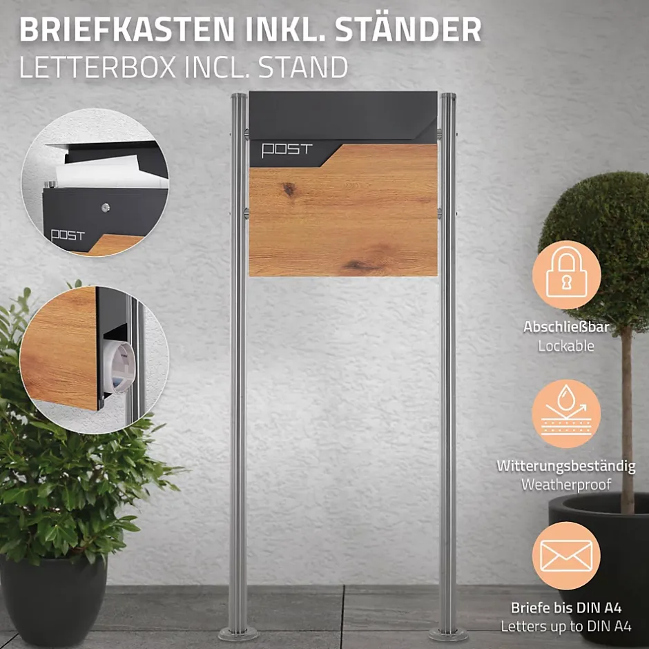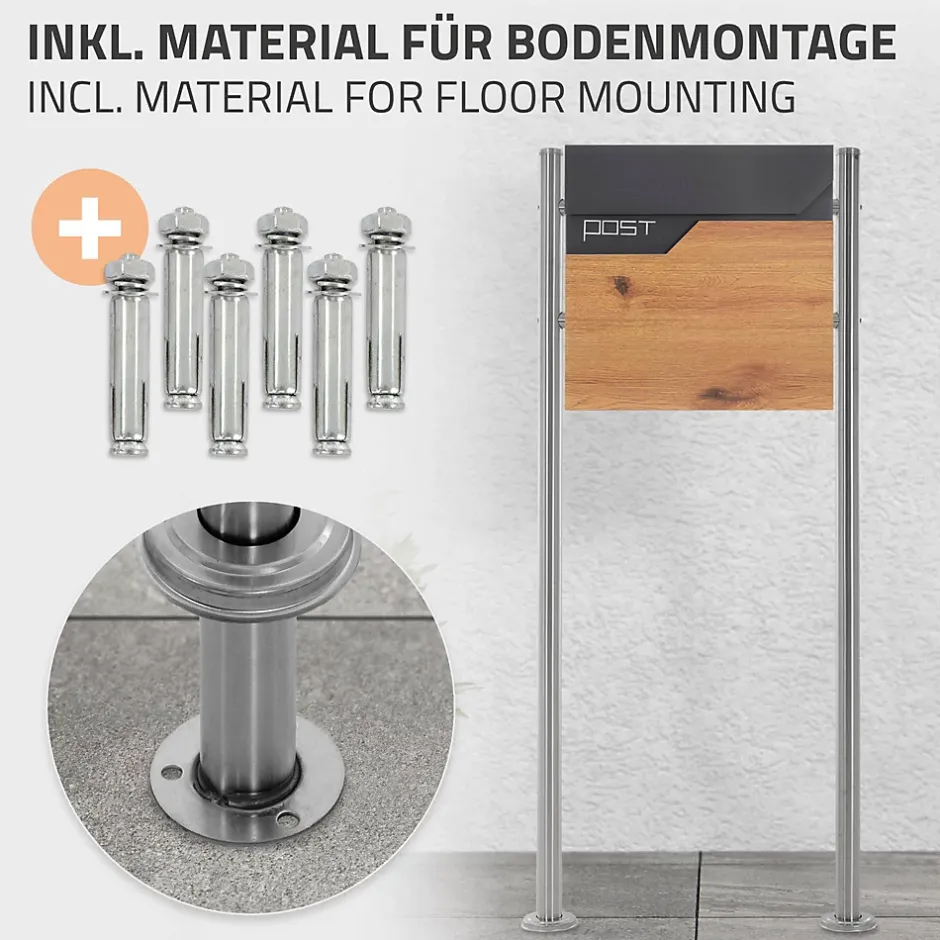 Description du produit :Boîte aux lettresCes boîtes aux lettres de ML-Design en acier inoxydable robuste et revêtu par poudre convainquent par leur design moderne et protègent ton courrier de manière fiable contre l’humidité et la saleté. Le revêtement de haute qualité est particulièrement durable et facile à entretenir et te garantit une utilisation sans problème.Le grand casier à courrier, que tu peux fermer en toute sécurité à l’aide des deux clés fournies, est particulièrement pratique. D’autres avantages sont le rouleau à journaux intégré ainsi que la grande ouverture d’introduction.SupportLe support de boîte aux lettres de ML-Design est beau, moderne et adapté à ta boîte aux lettres. Il est livré avec 6 ancrages au sol adaptés pour fixer rapidement et facilement le support de boîte aux lettres dans le sol. Le support de boîte aux lettres est fabriqué à partir de matériaux de haute qualité et est bien fini, ce qui lui confère une grande longévité. L’acier inoxydable revêtu par poudre assure la résistance du support de boîte aux lettres aux intempéries. Tu peux facilement combiner le support de boîte aux lettres avec la boîte aux lettres de ton choix.Le support de boîte aux lettres en acier inoxydable est un bel ajout à ton terrain. Un autre avantage du support de boîte aux lettres est que tu n’es pas obligé de fixer la boîte aux lettres directement à ta maison. Tu peux aisément installer le support de boîte aux lettres dans le sol et y fixer la boîte aux lettres sans avoir à faire de trous dans la façade de la maison.Tu trouveras aussi bien des supports de boîtes aux lettres que des boîtes aux lettres traditionnelles et adaptées dans notre boutique en ligne à un prix avantageux.Contenu de la livraison :1 x support de boîte aux lettres, y compris 6 ancrages au solmatériel de montage et instructions de montage inclus1 x boîte aux lettres1 x kit d’accessoires (y compris 2 clés, entretoise, matériel de montage)