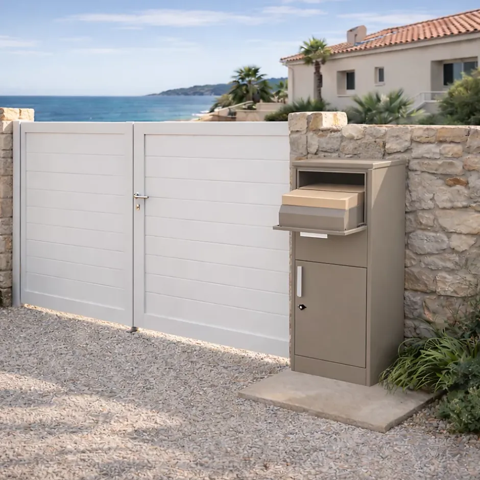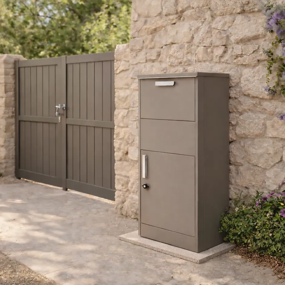 Une boîte aux lettres taupe élégante et résistante, pensée pour recevoir courrier et petits colis en toute simplicité. Son design contemporain et son compartiment colis intégré facilitent vos livraisons au quotidien.