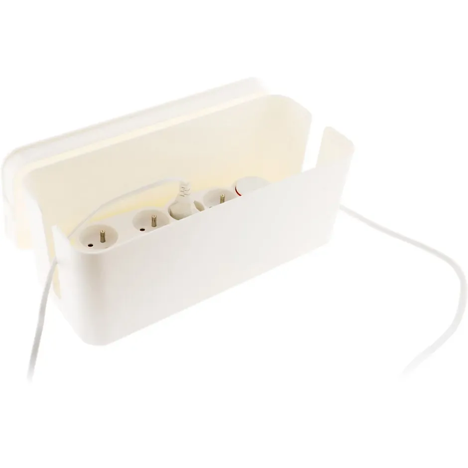 Boîte cache multiprise. Couleur(s) : blanc. Discrète dissimulation des multiprises et câbles électriques. Facilite l’accès à la multiprise et aux câbles. Permet d’accueillir une multiprise standard et les excédents de câbles. Améliore l’esthétique et le rangement des branchements électriques. Sobre et moderne, s’intègre dans tous les environnements (bureau, salon, etc.). Limite l’encombrement visuel et évite l’accumulation de poussière sur les branchements