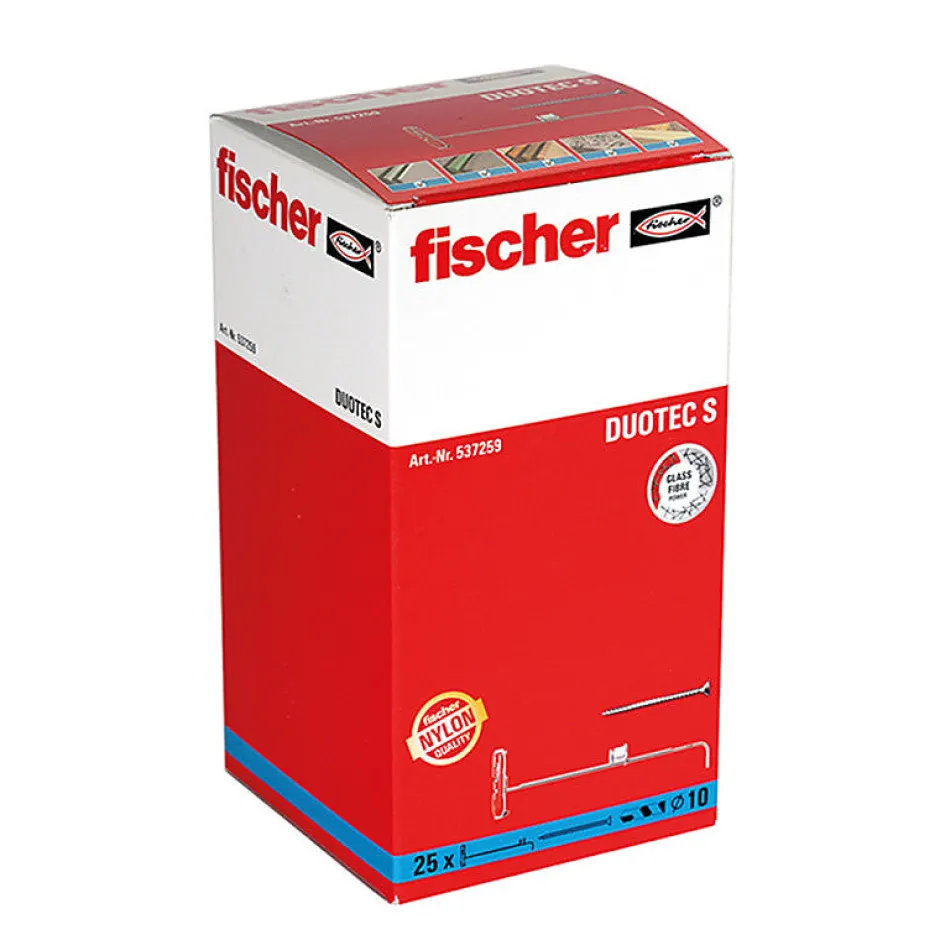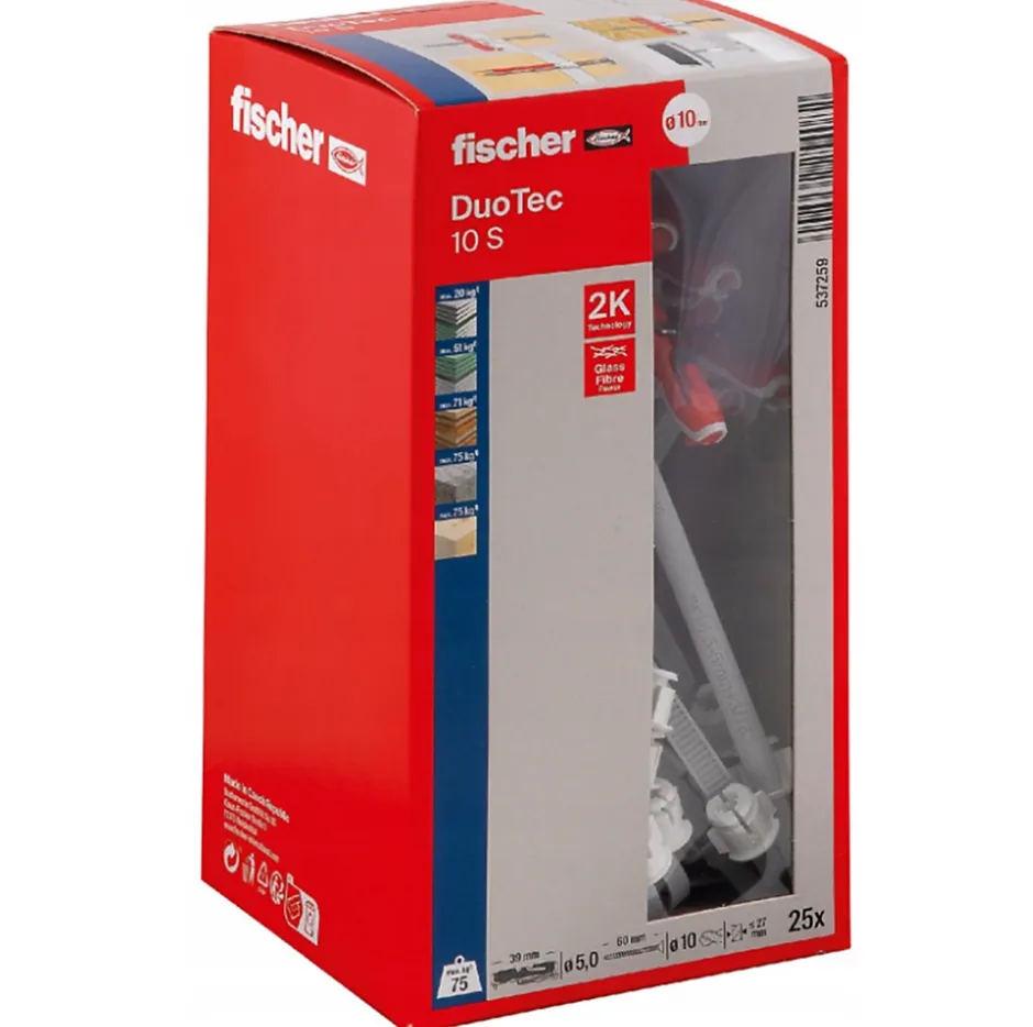 La cheville basculante en nylon, facile à installer, pour charges élevées dans tous les matériaux en plaques Avantages / Description du produit Logement flexible de la vis permettant l’utilisation de vis et crochets avec différents types de filetage. Les plastiques renforcés de fibres de verre garantissent la reprise de fortes charges de traction et transversales dans tous les matériaux en plaques. La surface d’appui souple en nylon gris répartit la charge sur la surface de la plaque et minimise ainsi l’affaiblissement du matériau porteur. Diamètres de perçage courants et élément basculant court pour un montage facile dans des cavités étroites, même isolées. Douille à collerette blanche avec fonction de verrouillage permettant un prémontage rapide et sûr de la cheville dans le trou. La cheville basculante en nylon fischer DuoTec permet de supporter des charges élevées en traction et transversales grâce à ses 2 composants. Montage simple avec un faible diamètre de perçage de 10 mm et un élément basculant court, même dans des cavités étroites et isolées. Prémontage facile, la cheville ne tombe pas dans le trou même sans vis. Aucune découpe ni affaiblissement de la plaque de plâtre. L’élément basculant se déploie automatiquement derrière la plaque et assure ainsi sa capacité de charge. Grâce au logement flexible en acier inoxydable, la cheville peut être utilisée avec des vis à bois, des vis pour panneaux agglomérés ou des crochets et tiges filetées métriques avec contre-écrou. En cas de perçage dans des matériaux pleins, elle fonctionne comme une cheville à expansion.